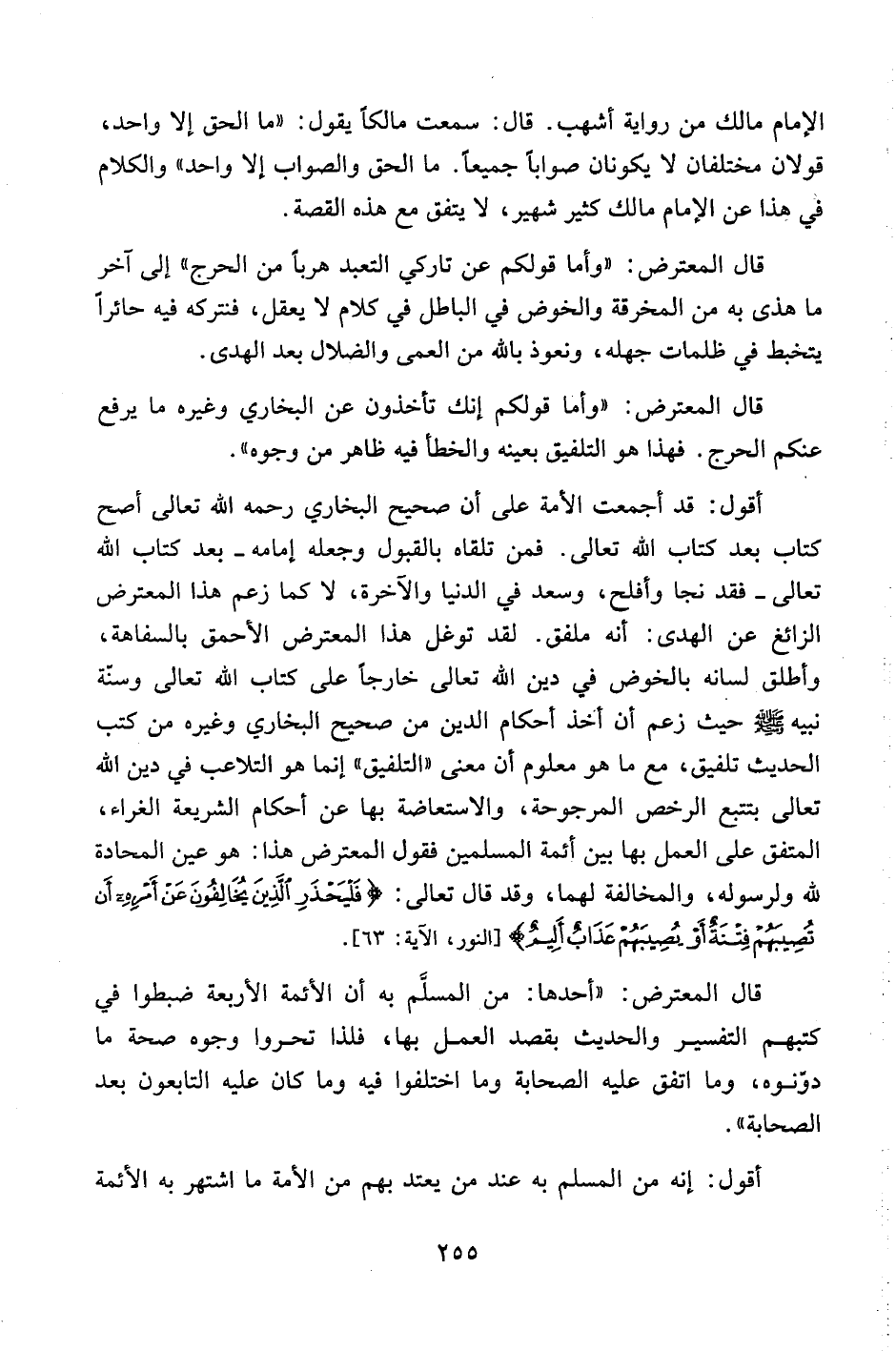 أقول: قد أجتمعت الأمة على أن صحيح البخاري رحمه الله تعالى أصح كتاب بعد كتاب الله تعالى. فمن تلقاه بالقبول وجعله إمامه- بعد كتاب الله تعالى- فقد نجا وأفلح، وسعد في الدنيا والآخرة، لا كما زعم هذا المعترض الزائغ عن الهدى: أنه ملفق. لقد توغل هذا المعترض الأحمق بالسفاهة، وأطلق لسانه بالخوض في دين الله تعالى خارجاً على كتاب الله تعالى وسنة نبيه صلى الله عليه وسلم حيث زعم أن أخذ أحكام الدين من صحيح البخاري وغيره من كتب الحديث تلفيق، مع ما هو معلوم أن معنى "التلفيق" إنما هو التلاعب في دين الله تعالى بتتبع الرخص المرجوحة، والاستعاضة بها عن أحكام الشريعة الغراء، المتفق على العمل بها بين أئمة المسلمين فقول المعترض هذا: هو عين المحادة لله ولرسوله، والمخالفة لهما، وقد قال تعالى: {فَلْيَحْذَرِ الَّذِينَ يُخَالِفُونَ عَنْ أَمْرِهِ أَنْ تُصِيبَهُمْ فِتْنَةٌ أَوْ يُصِيبَهُمْ عَذَابٌ أَلِيمٌ} [النور، الآية:63] .