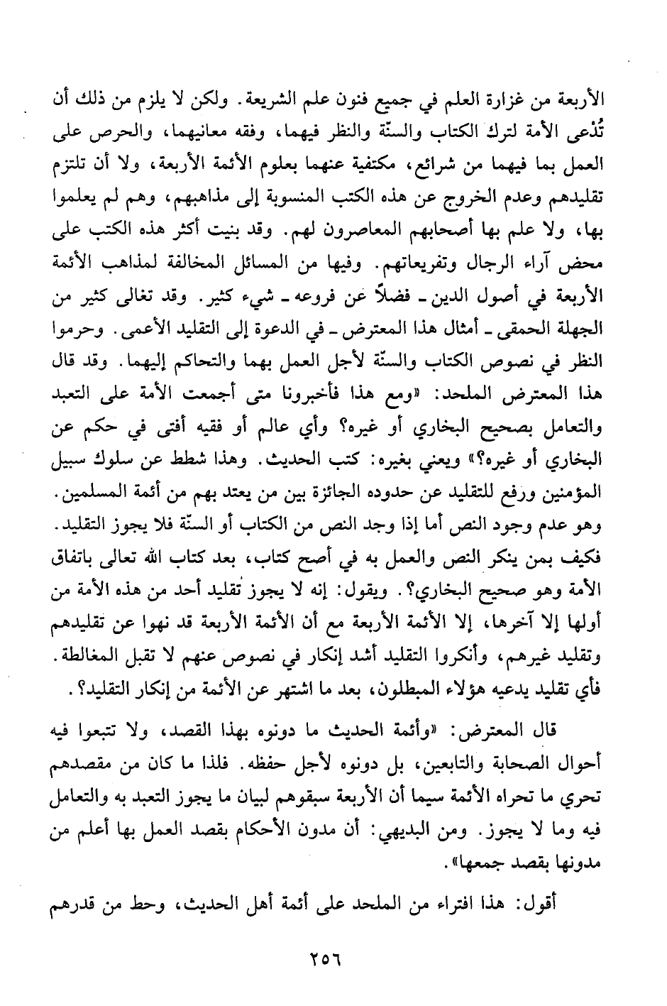 الأربعة من غزارة العلم في جميع فنون علم الشريعة. ولكن لا يلزم من ذلك أن تدعى الأمة لترك الكتاب والسنة والنظر فيهما، وفقه معانيهما، والحرص على العمل بما فيهما من شرائع، مكتفية عنهما بعلوم الأئمة الأربعة، ولا أن تلتزم تقليدهم وعدم الخروج عن هذه الكتب المنسوبة إلى مذاهبهم، وهم لم يعلموا بها، ولا علم بها أصحابهم المعاصرون لهم. وقد بنيت أكثر هذه الكتب على محض آراء الرجال وتفريعاتهم. وفيها من المسائل المخالفة لمذاهب الأئمة الأربعة في أصول الدين – فضلا عن فروعه- شيء كثير. وقد تغالى كثير من الجهلة الحمقى- أمثال هذا المعترض- في الدعوة إلى التقليد الأعمى. وحرموا النظر في نصوص الكتاب والسنة لأجل العمل بهما والتحاكم إليهما. وقد قال هذا المعترض الملحد: "ومع هذا فأخبرونا متى اجتمعت الأمة على التعبد والتعامل بصحيح البخاري أو غيره؟ وأي عالم أو فقيه أفتى في حكم عن البخاري أو غيره؟ " ويعني بغيره: كتب الحديث. وهذا شطط عن سلوك سبيل المؤمنين ورفع للتقليد عن حدوده الجائزة بين من يعتد بهم من أئمة المسلمين. وهو عدم وجود النص أما إذا وجد النص من الكتاب أو السنة فلا يجوز التقليد. فكيف بمن ينكر النص والعمل به في أصح كتاب، بعد كتاب الله تعالى باتفاق الأمة وهو صحيح البخاري؟. ويقول: إنه لا يجوز تقليد أحد من هذه الأمة من أولها إلا آخرها، إلا الأئمة الأربعة مع أن الأئمة الأربعة قد نهوا عن تقليدهم وتقليد غيرهم، وأنكروا التقليد أشد إنكار في نصوص عنهم لا تقبل المغالطة. فأي تقليد يدعيه هؤلاء المبطلون، بعد ما اشتهر عن الأئمة من إنكار التقليد؟.