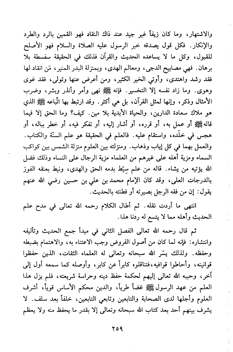 انتهى ما أردت نقله. ثم أطال الكلام رحمه الله تعالى في مدح علم الحديث وأهله مما لا يتسع له ردنا هذا.