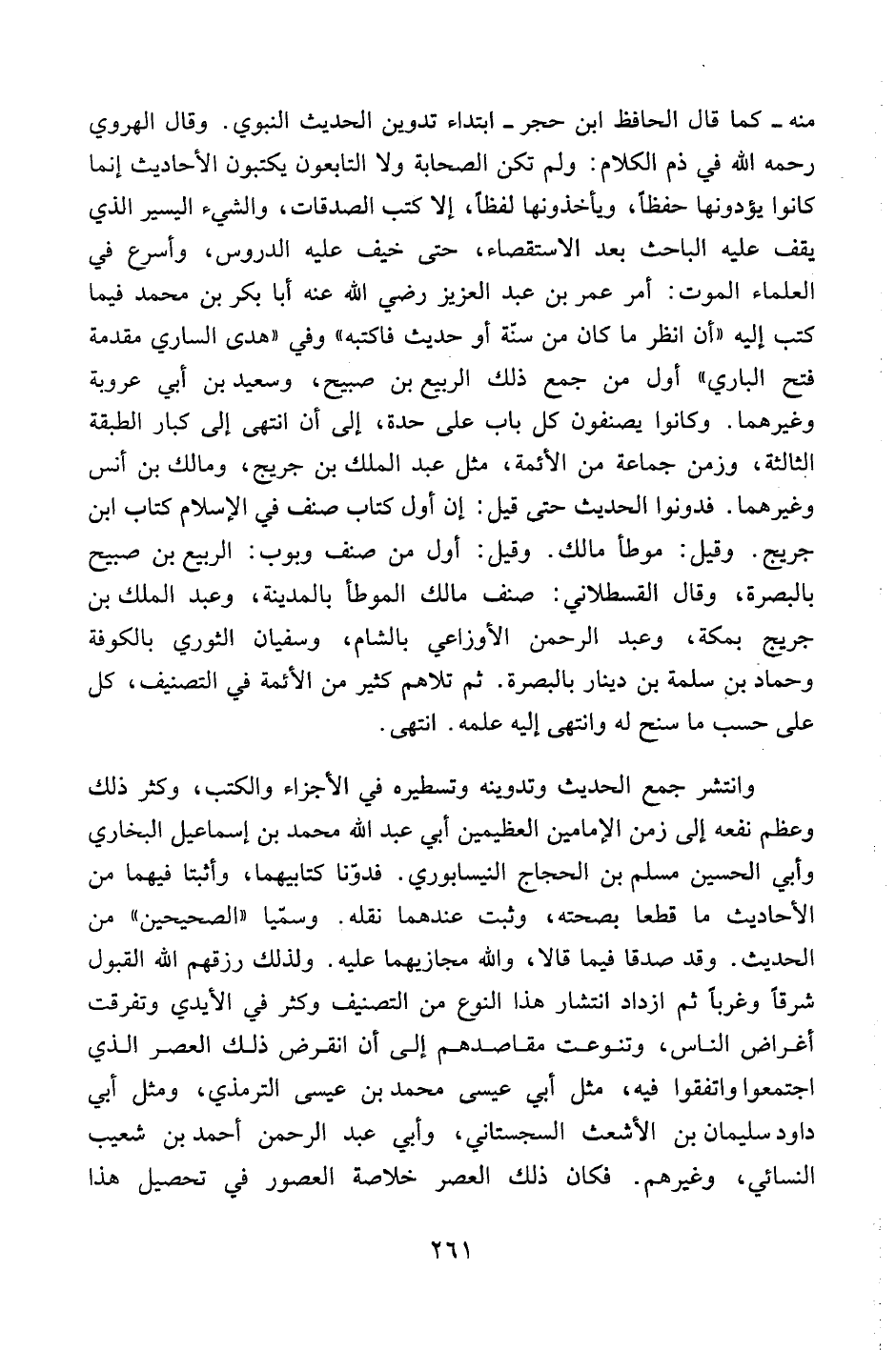 وانتشر جمع الحديث وتدوينه وتسطيره في الأجزاء والكتب، وكثر ذلك وعظم نفعه إلى زمن الإمامين العظيمين أبي عبد الله محمد بن إسماعيل البخاري وأبي الحسين مسلم بن الحجاج النيسابوري. فدونا كتابيهما، وأثبتا فيهما من الأحاديث ما قطعا بصحته، وثبت عندهما نقله. وسميا "الصحيحين" من الحديث. وقد صدقا فيما قالا، والله مجازيهما عليه. ولذلك رزقهم الله القبول شرقاً وغرباً ثم ازداد انتشار هذا النوع من التصنيف وكثر في الأيدي وتفرقت أغراض الناس، وتنوعت مقاصدهم إلى أن انقرض ذلك العصر الذي اجتمعوا واتفقوا فيه، مثل أبي عيسى محمد بن عيسى الترمذي، ومثل أبي داود سليمان بن الأشعت السجستاني، وأبي عبد الرحمن أحمد بن شعيب النسائي، وغيرهم. فكان ذلك العصر خلاصة العصور في تحصيل هذا