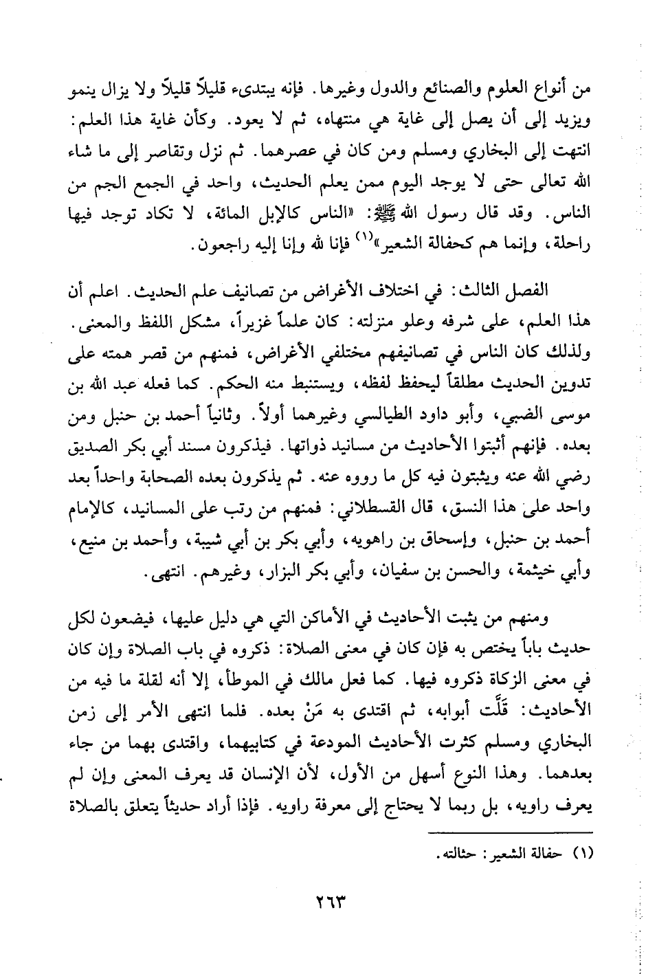 من أنواع العلوم والصنائع والدول وغيرها. فإنه يبتدئ قليلاً قليلاً ولا يزال ينمو ويزيد إلى أن يصل إلى غاية هي منتهاه، ثم لا يعود. وكأن غاية هذا العلم: انتهت إلى البخاري ومسلم ومن كان في عصرهما. ثم نزل وتقاصر إلى ما شاء الله تعالى حتى لا يوجد اليوم ممن يعلم الحديث، واحد في الجمع الجم من الناس. وقد قال رسول الله صلى الله عليه وسلم: "الناس كالإبل المائة، لا تكاد توجد فيها راحلة، وإنما هم كحفالة الشعير" (1) فإنا لله وإنا إليه راجعون.