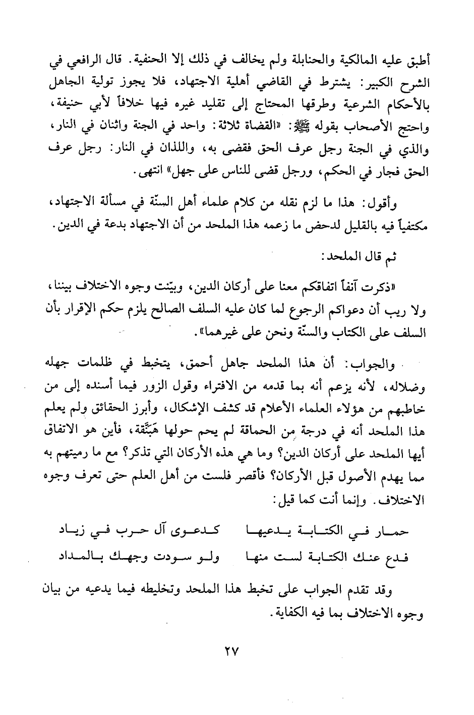 وأقول: هذا ما لزم نقله من كلام علماء أهل السنة في مسألة الاجتهاد، مكتفياً فيه بالقليل لدحض ما زعمه هذا الملحد من أن الاجتهاد بدعة في الدين.