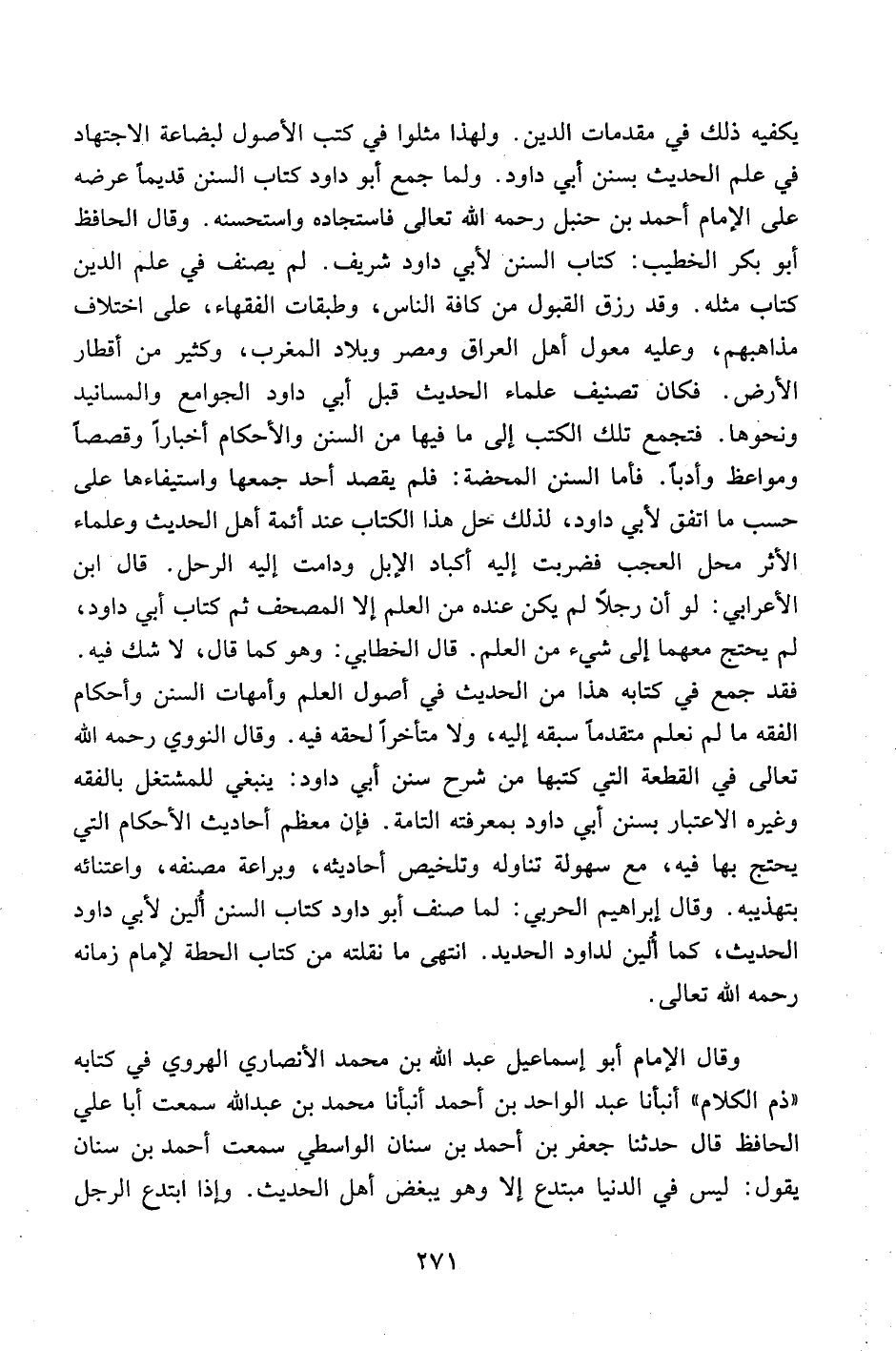 يكفيه ذلك في مقدمات الدين. ولهذا مثلوا في كتب الأصول لبضاعة الاجتهاد في علم الحديث بسنن أبي داود. ولما جمع أبو داود كتاب السنن قديماً عرضه على الإمام أحمد بن حنبل رحمه الله تعالى فاستجاده واستحسنه. وقال الحافظ أبو بكر الخطيب: كتاب السنن لأبي داود شريف. لم يصنف في علم الدين كتبا مثله. وقد رزق القبول من كافة الناس، وطبقات الفقهاء، على اختلاف مذاهبهم، وعليه معول أهل العراق ومصر وبلاد المغرب، وكثير من أقطار الأرض. فكان تصنيف علماء الحديث قبل أبي داود الجوامع والمسانيد ونحوها. فتجمع تلك الكتب إلى ما فيها من السنن والأحكام أخباراً وقصصاً ومواعظ وأدباً. فأما السنن المحضة: فلم يقصد أحد جمعها واستيفاءها على حسب ما اتفق لأبي داود، لذلك حل هذا الكتاب عند أئمة أهل الحديث وعلماء الأثر محل العجب فضربت إليه أكباد الإبل ودامت إليه الرحل. قال ابن الأعرابي: لو أن رجلاً لم يكن عنده من العلم إلا المصحف ثم كتاب أبي داود، لم يحتج معهما إلى شيء من العلم. قال الخطابي: وهو كما قال، لا شك فيه. فقد جمع في كتابه هذا من الحديث في أصول العلم وأمهات السنن وأحكام الفقه ما لم نعلم متقدماً سبقه إليه، ولا متأخراً لحقه فيه. وقال النووي رحمه الله تعالى في القطعة التي كتبها من شرح سنن أبي داود: ينبغي للمشتغل بالفقه وغيره الاعتبار بسنن أبي داود بمعرفته التامة. فإن معظم أحاديث الأحكام التي يحتج بها فيه، مع سهولة تناوله وتلخيص أحاديثه، وبراعة مصنفة، واعتنائه بتهذيبه. وقال إبراهيم الحربي: لما صنف أبو داود كتاب السنن ألين لأبي داود الحديث، كما ألين لداود الحديد. انتهى ما نقلته من كتاب الحطة لإمام زمانه رحمه الله تعالى.