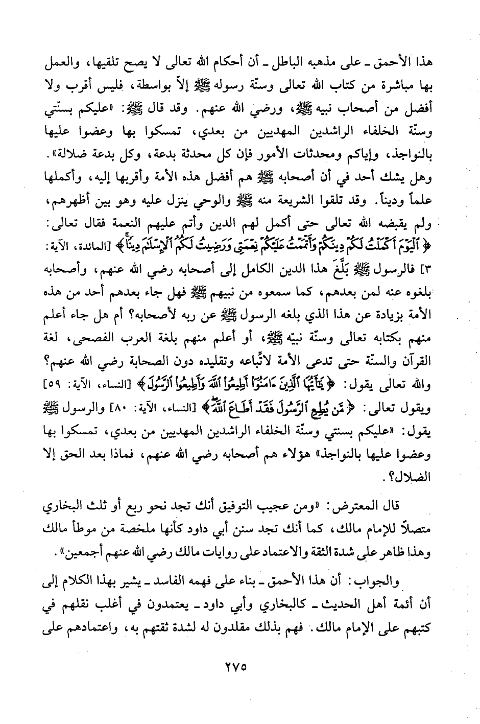 هذا الأحمق – على مذهبه الباطل – أن أحكام الله تعالى لا يصح تلقيها، والعمل بها مباشرة من كتاب الله تعالى وسنة رسوله صلى الله عليه وسلم إلا بواسطة، فليس أقرب ولا أفضل من أصحاب نبيه صلى الله عليه وسلم، ورضي الله عنهم. وقد قال صلى الله عليه وسلم: "عليكم بسنتي وسنة الخلفاء الراشدين المهديين من بعدي، تمسكوا بها وعضوا عليها بالنواجذ، وإياكم ومحدثات الأمور فإن كل محدثة بدعة، وكل بدعة ضلالة". وهل يشك أحد في أن أصحابه صلى الله عليه وسلم هم أفضل هذه الأمة وأقربها إليه، وأكملها علماً وديناً. وقد تلقوا الشريعة منه صلى الله عليه وسلم والوحي ينزل عليه وهو بين أظهرهم، ولم يقبضه الله تعالى حتى أكمل لهم الدين وأتم عليهم النعمة فقال تعالى: {الْيَوْمَ أَكْمَلْتُ لَكُمْ دِينَكُمْ وَأَتْمَمْتُ عَلَيْكُمْ نِعْمَتِي وَرَضِيتُ لَكُمُ الْأِسْلامَ دِيناً} [المائدة، الآية: 3] فالرسول صلى الله عليه وسلم بلغ هذا الدين الكامل إلى أصحابه رضي الله عنهم، وأصحابه بلغوه عنه لمن بعدهم، كما سمعوه من نبيهم صلى الله عليه وسلم فهل جاء بعدهم أحد من هذه الأمة بزيادة عن هذا الذي بغله الرسول صلى الله عليه وسلم عن ربه لأصحابه؟ أم هل جاء أعلم منهم بكتابه تعالى وسنة نبيه صلى الله عليه وسلم، أو أعلم منهم بلغة العرب الفصحى، لغة القرآن والسنة حتى تدعى الأمة لاتباعه وتقليده دون الصحابة رضي الله عنهم؟ والله تعالى يقول: {يَا أَيُّهَا الَّذِينَ آمَنُوا أَطِيعُوا اللَّهَ وَأَطِيعُوا الرَّسُولَ} [النساء، الآية: 59] ويقول تعالى: {مَنْ يُطِعِ الرَّسُولَ فَقَدْ أَطَاعَ اللَّهَ} [النساء، الآية: 80] والرسول صلى الله عليه وسلم يقول: "عليكم بسنتي وسنة الخلفاء الراشدين المهديين من بعدي، تمسكوا بها وعضوا عليها بالنواجذ" هؤلاء هم أصحابه رضي الله عنهم، فماذا بعد الحق إلا الضلال؟.