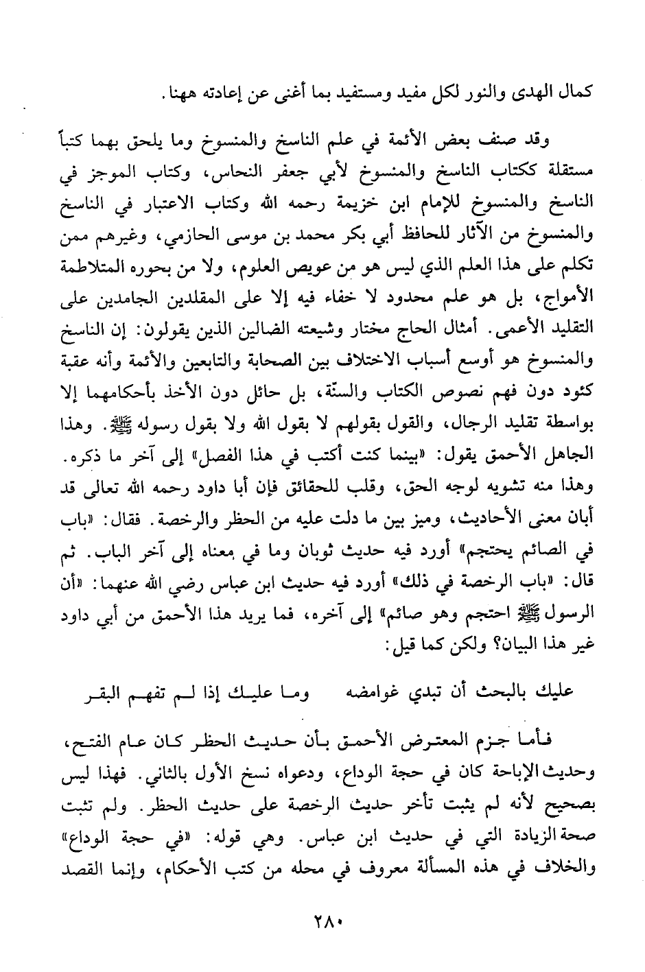 وقد صنف بعض الأئمة في علم الناسخ والمنسوخ وما يلحق بهما كتباً مستقلة ككتاب الناسخ والمنسوخ لأبي جعفر النحاس، وكتاب الموجز في الناسخ والمنسوخ للإمام ابن خزيمة رحمه الله وكتاب الاعتبار في الناسخ والمنسوخ من الآثار للحافظ أبي بكر محمد بن موسى ألحازمي، وغيرهم ممن تكلم على هذا العلم الذي ليس هو من عويص العلوم، ولا من بحوره المتلاطمة الأمواج، بل هو علم محدود لا خفاء فيه إلا على المقلدين الجامدين على التقليد الأعمى. أمثال الحاج مختار وشيعته الضالين الذين يقولون: إن الناسخ والمنسوخ هو أوسع أسباب الاختلاف بين الصحابة والتابعين والأئمة وأنه عقبة كئود دون فهم نصوص الكتاب والسنة، بل حائل دون الأخذ بأحكامهما إلا بواسطة تقليد الرجال، والقول بقولهم لا بقول الله ولا بقول رسول الله صلى الله عليه وسلم. وهذا الجاهل الأحمق يقول: "بينما كنت أكتب في هذا الفصل" إلى آخر ما ذكره. وهذا منه تشويه لوجه الحق، وقلب للحقائق فإن أبا داود رحمه الله تعالى قد أبان معنى الأحاديث، وميز بين ما دلت عليه من الحظر والرخصة. فقال: "باب في الصائم يحتجم" أورد فيه حديث ثوبان وما في معنا إلى آخر الباب. ثم قال: "باب الرخصة في ذلك" أورد فيه حديث ابن عباس رضي الله عنهما: "أن الرسول صلى الله عليه وسلم احتجم وهو صائم" إلى آخره، فما يريد هذا الأحمق من أبي داود غير هذا البيان؟ ولكن كما قيل: