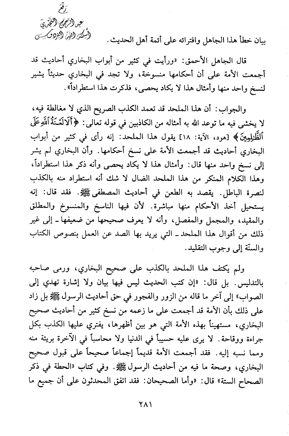 والجواب: أن هذا الملحد قد تعمد الكذب الصريح الذي لا مغالطة فيه، لا يخشى فيه ما توعد الله به أمثاله من الكاذبين في قوله تعالى: {أَلا لَعْنَةُ اللَّهِ عَلَى الظَّالِمِينَ} [هود، الآية:18] يقول هذا الملحد: إنه رأى في كثير من أبواب البخاري أحاديث قد أجمعت الأمة على نسخ أحكامها. وأن البخاري لم يشر إلى نسخ واحد منها قال: وأمثال هذا لا يكاد يحصى وأنه ذكر هذا استطراداً، وهذا الكلام المنكر من هذا الملحد الضال لا شك أنه استطراداً منه بالكذب لنصرة الباطل. يقصد به الطعن في أحاديث المصطفى صلى الله عليه وسلم. فقد قال: إنه يستحيل أخذ الأحكام منها مباشرة. لأن فيها الناسخ والمنسوخ والمطلق والمقيد، والمجمل والمفصل، وأنه لا يعرف صحيحها من ضعيفها- إلى غير ذلك من أقوال هذا الملحد – التي يريد بها الصد عن العمل بنصوص الكتاب والسنة إلى وجوب التقليد.