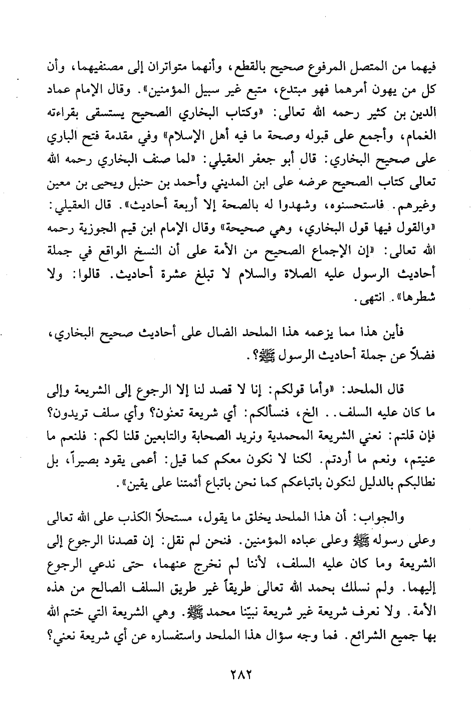 الجواب: أن هذا الملحد يخلق ما يقول، مستحلاً الكذب على الله تعالى وعلى رسوله صلى الله عليه وسلم وعلى عباده المؤمنين. فنحن لم نقل: إن قصدنا الرجوع إلى الشريعة وما كان عليه السلف، لأننا لم نخرج عنهما، حتى ندعي الرجوع إليهما. ولم نسلك بحمد الله تعالى طريقاً غير طريق السلف الصالح من هذه الأمة. ولا نعرف شريعة غير شريعة نبينا محمد صلى الله عليه وسلم. وهي الشريعة التي ختم الله بها جميع الشرائع. فما وجه سؤال هذا الملحد واستفساره عن أي شريعة نعني؟