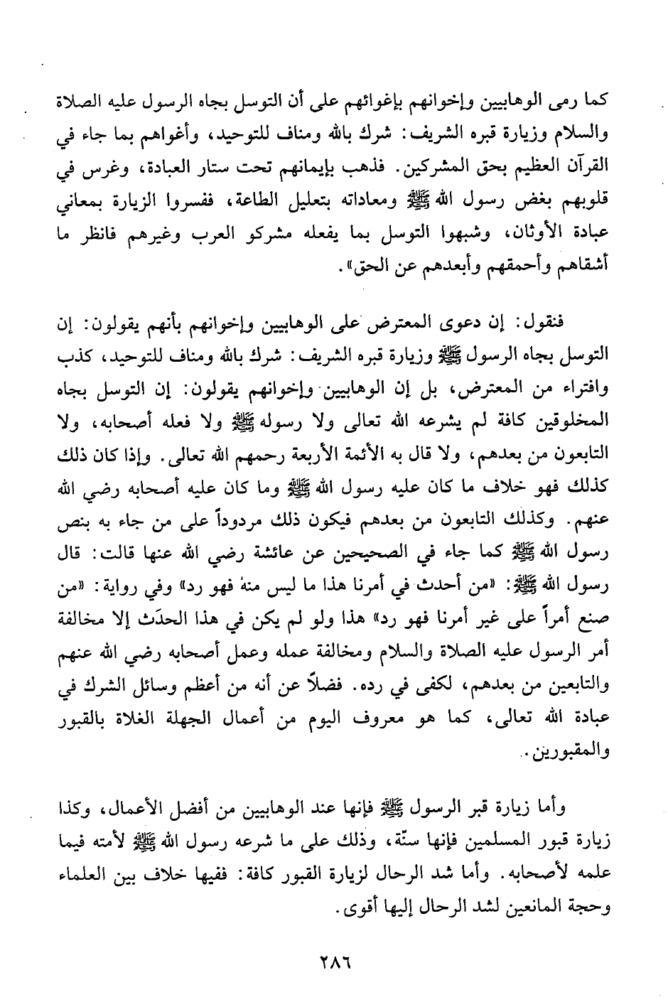 كما رمى الوهابيين وإخوانهم بإغواهئم على أن التوسل بجاه الرسول عليه الصلاة والسلام وزيارة قبره الشريف: شرك بالله ومناف للتوحيد، وأغواهم بما جاء في القرآن العظيم بحق المشركين. فذهب بإيمانهم تحت ستار العبادة، وغرس في قلوبهم بغض رسول الله صلى الله عليه وسلم ومعاداته بتعليل الطاعة، ففسروا الزيارة بمعاني عبادة الأوثان، وشبهوا التوسل بما يفعله مشركو العرب وغيرهم فانظر ما أشقاهم وأحمقهم وأبعدهم عن الحق".