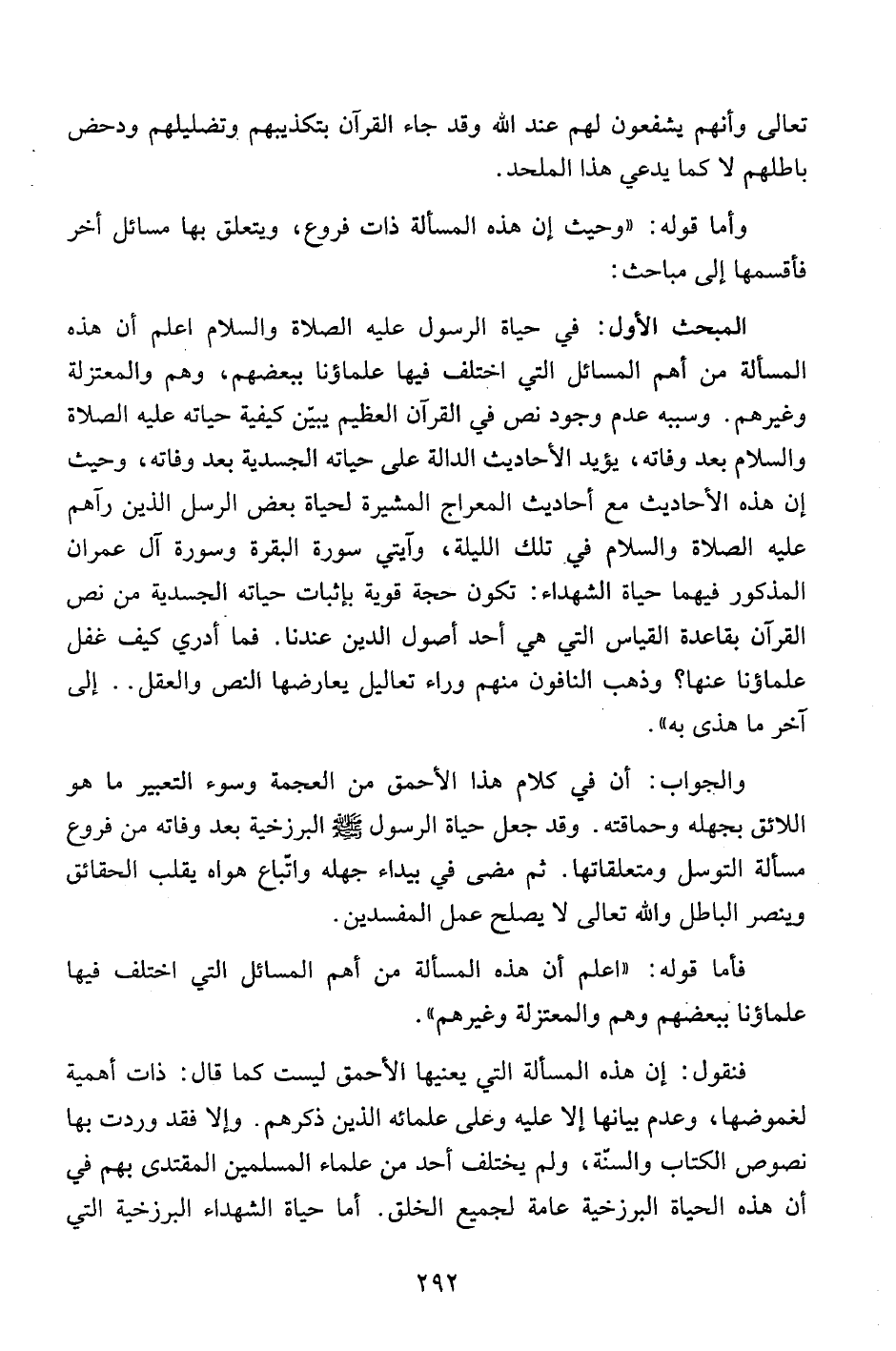 المبحث الأول: في حياة الرسول عليه الصلاة والسلام أعلم أن هذه المسألة من أهم المسائل التي اختلف فيها علماؤها ببعضهم، وهم والمعتزلة وغيرهم. وسببه عدم وجود نص في القرآن العظيم يبيّن كيفية حياته عليه الصلاة والسلام بعد وفاته، يؤيد الأحاديث الدالة على حياته الجسدية بعد وفاته، وحيث إن هذه الأحاديث مع أحاديث المعراج المشيرة لحياة بعض الرسل الذين رآهم عليه الصلاة والسلام في تلك الليلة، وآيتي سورة البقرة وسورة آل عمران المذكور فيهما حياة الشهداء: تكون حجة قوية بإثبات حياته الجسدية من نص القرآن بقاعدة القياس التي هي أحد أصول الدين عندنا. فما أدري كيف غفل علماؤنا عنها؟ وذهب النافون منهم وراء تعاليل يعارضها النص والعقل ... إلى آخر ما هذى به".