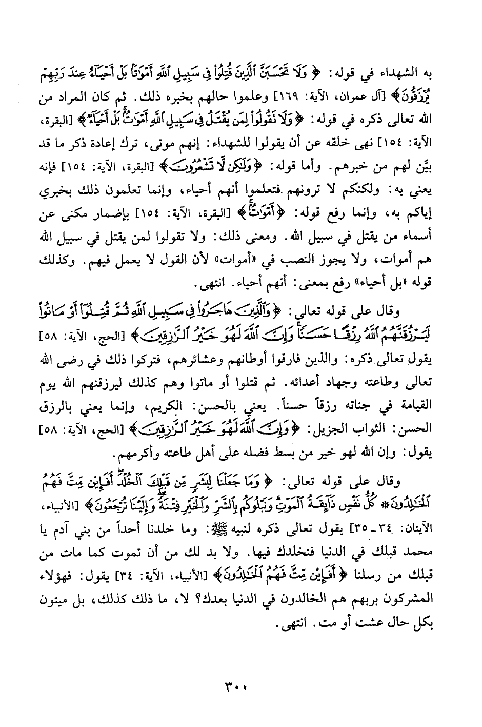 به الشهداء في قوله: {وَلا تَحْسَبَنَّ الَّذِينَ قُتِلُوا فِي سَبِيلِ اللَّهِ أَمْوَاتاً بَلْ أَحْيَاءٌ عِنْدَ رَبِّهِمْ يُرْزَقُونَ} [آل عمران، الآية:169] وعلموا حالهم بخبره ذلك. ثم كان المراد من الله تعالى ذكره في قوله: {وَلا تَقُولُوا لِمَنْ يُقْتَلُ فِي سَبِيلِ اللَّهِ أَمْوَاتٌ بَلْ أَحْيَاءٌ} [البقرة، الآية:154] نهى خلقه عن أن يقولوا للشهداء: إنهم موتى، ترك إعادة ذكر ما قد بيَّن لهم من خبرهم. وأما قوله: {وَلَكِنْ لا تَشْعُرُونَ} [البقرة، الآية:154] فإنه يعني به: ولكنكم لا ترونهم فتعلمون أنهم أحياء، وإنما تعلمون ذلك بخبري إياكم به، وإنما رفع قوله: {أَمْوَاتٌ} [البقرة، الآية:154] بإضمار مكنى عن أسماء من يقتل في سبيل الله. ومعنى ذلك: ولا تقولوا لمن يقتل في سبيل الله هم أموات، ولا يجوز النصب في "أموات" لأن القول لا يعمل فيهم. وكذلك قوله "بل أحياء" رفع بمعنى: أنهم أحياء. انتهى.