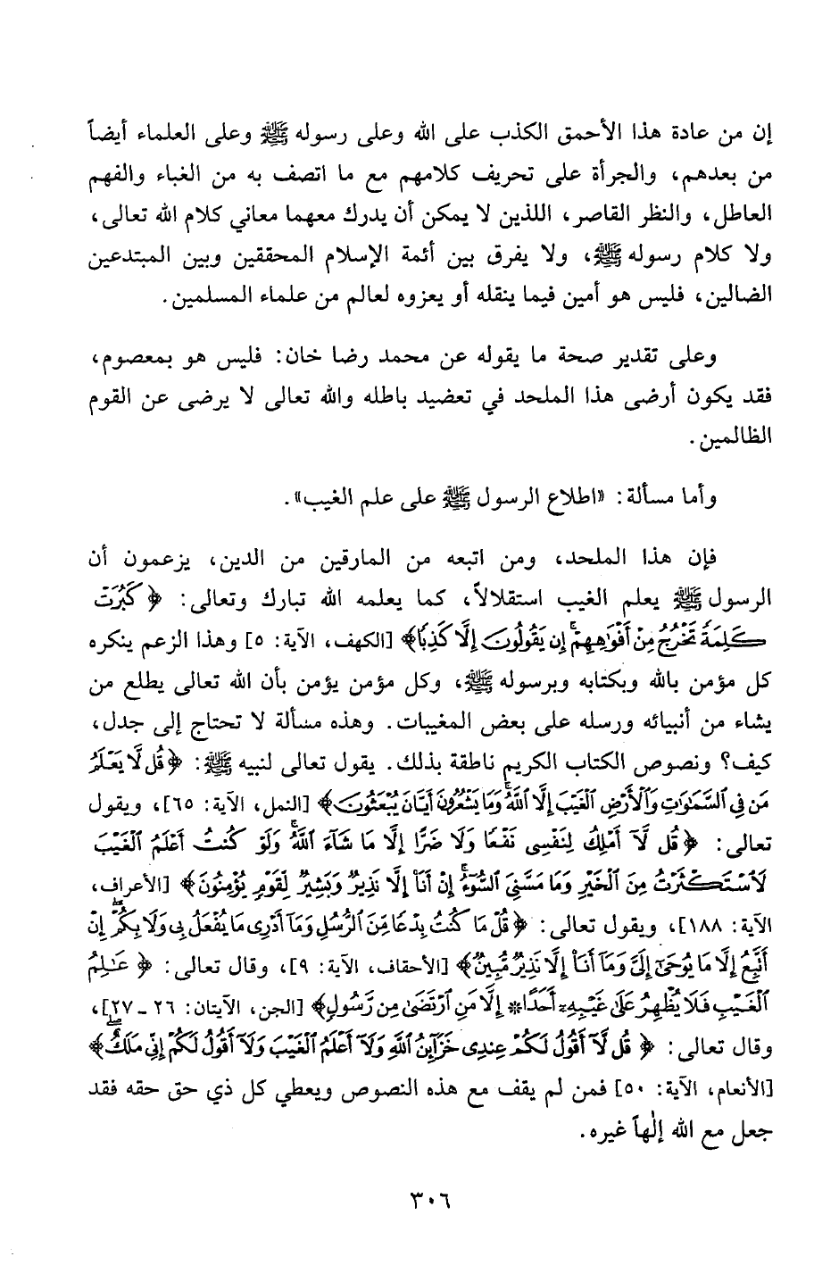 فإن هذا الملحد، ومن أتبعه من المارقين من الدين، يزعمون أن الرسول صلى الله عليه وسلم يعلم الغيب استقلالاً، كما يعلمه الله تبارك وتعالى: {كَبُرَتْ كَلِمَةً تَخْرُجُ مِنْ أَفْوَاهِهِمْ إِنْ يَقُولُونَ إِلَّا كَذِباً} [الكهف، الآية:5] وهذا الزعم ينكره كل مؤمن بالله وبكتابه وبرسوله صلى الله عليه وسلم، وكل مؤمن يؤمن بأن الله تعالى يطلق من يشاء من أنبيائه ورسله على بعض المغيبات. وهذه مسألة لا تحتاج إلى جدل، كيف؟ ونصوص الكتاب والكريم ناطقة بذلك. يقول تعالى لنبيه صلى الله عليه وسلم: {قُلْ لا يَعْلَمُ مَنْ فِي السَّمَاوَاتِ وَالْأَرْضِ الْغَيْبَ إِلَّا اللَّهُ وَمَا يَشْعُرُونَ أَيَّانَ يُبْعَثُونَ} [النمل، الآية:65] ، ويقول تعالى: {قُلْ لا أَمْلِكُ لِنَفْسِي نَفْعاً وَلا ضَرّاً إِلَّا مَا شَاءَ اللَّهُ وَلَوْ كُنْتُ أَعْلَمُ الْغَيْبَ لَاسْتَكْثَرْتُ مِنَ الْخَيْرِ وَمَا مَسَّنِيَ السُّوءُ إِنْ أَنَا إِلَّا نَذِيرٌ وَبَشِيرٌ لِقَوْمٍ يُؤْمِنُونَ} [الأعراف، الآية:188} ويقول تعالى: {قُلْ مَا كُنْتُ بِدْعاً مِنَ الرُّسُلِ وَمَا أَدْرِي مَا يُفْعَلُ بِي وَلا بِكُمْ إِنْ أَتَّبِعُ إِلَّا مَا يُوحَى إِلَيَّ وَمَا أَنَا إِلَّا نَذِيرٌ مُبِينٌ} [الأحقاف، الآية:9] وقال تعالى: {عَالِمُ الْغَيْبِ فَلا يُظْهِرُ عَلَى غَيْبِهِ أَحَداً. إِلَّا مَنِ ارْتَضَى مِنْ رَسُولٍ فَإِنَّهُ يَسْلُكُ مِنْ بَيْنِ يَدَيْهِ وَمِنْ خَلْفِهِ رَصَداً} (الجن، الآيتان:26-27] وقال تعالى: {قُلْ لا أَقُولُ لَكُمْ عِنْدِي خَزَائِنُ اللَّهِ وَلا أَعْلَمُ الْغَيْبَ وَلا أَقُولُ لَكُمْ إِنِّي مَلَكٌ} [الأنعام، الآية:50] فمن لم يقف مع هذه النصوص ويعطي كل ذي حق حقه فقد جعل مع الله إلهاً غيره.