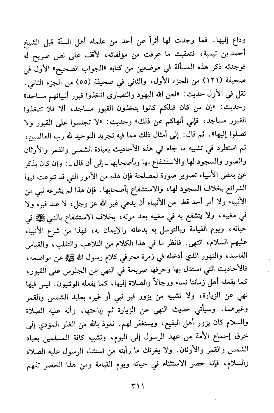 وداع إليها. فما وجدت لها أثراً عن أحد من علماء أهل السنّة قبل الشيخ أحمد بن تيمية، فتعقبت ما عرفت من مؤلفاته، لأقف على نص صريح له فوجدته ذكر هذه المسألة في موضعين من كتابه "الجواب الصحيح" الأول في صحيفة (121) من الجزء الأول، والثاني في صحيفة (55) من الجزء الثاني. نقل في الأول حديث: "لعن الله اليهود والنصارى اتخذوا قبور أنبيائهم مساجد، وحديث: "إن من كان قبلكم كانوا يتخذون القبور مساجد، ألا فلا تتخذوا القبور مساجد، فإني أنهاكم عن ذلك" وحديث: "لا تجلسوا على القبور ولا تصلوا إليها". ثم قال: إلى أمثال ذلك مما فيه تجريد التوحيد لله رب العالمين، صم استطرد في تشبيه ما جاء في هذه الأحاديث بعبادة الشمس والقمر والأوثان والصور والسجود لها والاستشفاع بها وبأصحابها- إلى أن قال-: وإن كان يذكر عن بعض الأنبياء تصوير صورة لمصلحة فإن هذه من الأمور التي قد تنوعت فيها الشرائع بخلاف السدود لها، والاستشفاع بأصحابها. فإن هذا لم يشرعه نبي من الأنبياء ولا أمر أحد قط من الأنبياء أن يدعي غير الله عز وجل، لا عند قبره ولا في مغبيه، ولا يتشفع به في مغيبه بعد موته، بخلاف الاستشفاع بالنبي صلى الله عليه وسلم في حياته، ويوم القيامة وبالتوسل به بدعائه والإيمان به، فهذا من شرع الأنبياء عليهم السلام، وانتهى. فانظر ما في هذا الكلام من التلاعب والتقلب، والقياس الفاسد، والتهور الذي أدخله في زمرة محرفي كلام رسول الله صلى الله عليه وسلم عن مواضعه، فالأحاديث التي استدل بها وحرفها صريحة في النهي عن الجلوس على القبور، كما يفعله أهل زماننا نساء ورجالاً والصلاة إليها، كما يفعله الوثنيون. ليس فيها نهي عن الزيارة، ولا تشبيه من يزور قبر نبي أو غيره بعابد الشمس والقمر وغيرهما. وسيأتي حيث النهي عن الزيارة ثم إباحتها، وأنه عليه الصلاة والسلام كان يزور أهل البيقع، ويستغفر لهم. ونعوذ بالله من الغلو المؤدي إلى خرق إجماع الأمة من عهد الرسول إلى اليوم، وتشبيه كافة المسلمين بعبادة الشمس والقمر والأوثان. ولا يغرنك ما رأيته من استثناء الرسول عليه الصلاة والسلام، فإنه حصر الاستثناء في حياته ويوم القيامة ومن هذا الحصر تفهم