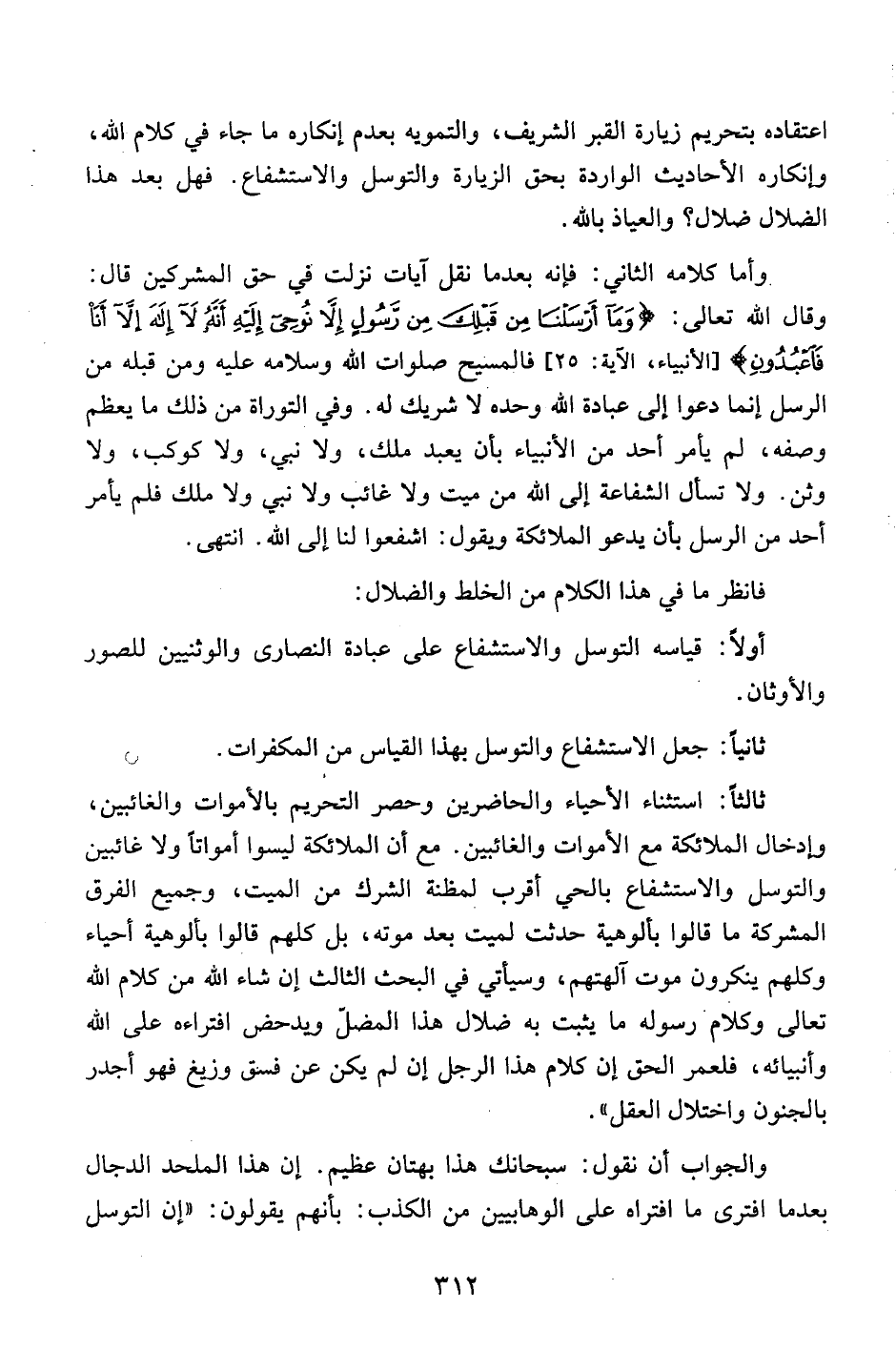 ثالثاً: استثناء الأحياء والحاضرين وحصر التحريم بالأموات والغائبين، وإدخال الملائكة مع الأموات والغائبين. مع أن الملائكة ليسوا أمواتاً ولا غائبين والتوسل والاستشفاع بالحي أقرب لمظنة الشرك من الميت، وجميع الفرق المشركة ما قالوا بألوهية حدثت لميت بعد موته، بل كلهم قالوا بألوهية أحياء وكلهم ينكرون موت آلهتهم، وسيأتي في البحث الثالث إن شاء الله من كلام الله تعالى رسوله ما يثبت به ضلال هذا المضلّ ويدحض افتراءه على الله وأنبيائه، فلعمر الحق إن كلام هذا الرجل إن لم يكن عن فسق وزيغ فهو أجدر بالجنون واختلال العقل".