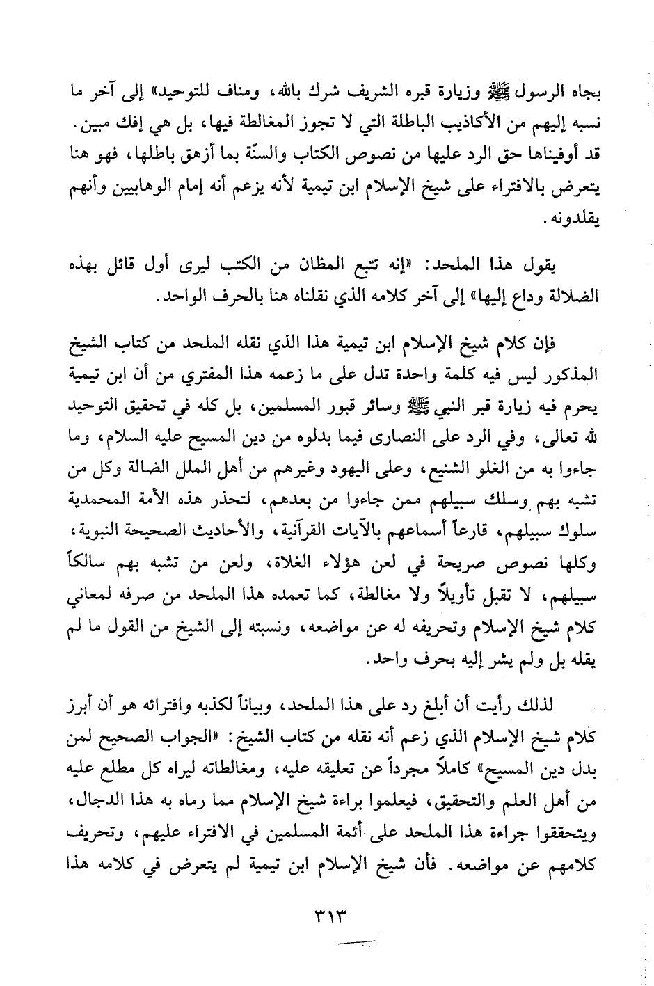 فإن كلام شيخ الإسلام ابن تيمية هذا الذين نقله الملحد من كتاب الشيخ المذكور ليس فيه كلمة واحدة تدل على ما زعمه هذا المفتري من أن ابن تيمية يحرم فيه زيارة قبر النبي صلى الله عليه وسلم وسائر قبور المسلمين، بل كله في تحقيق التوحيد لله تعالى، وفي الرد على النصارى فيما بدلوه من دين المسيح عليه السلام، وما جاءوا به من الغلو الشنيع، وعلى اليهود وغيرهم من أهل الملل الضالة وكل من تشبه بهم وسلك سبيلهم ممن جاءوا من بعدهم، لتحذر هذه الأمة المحمدية سلوك سبيلهم، قارعاً أسماعهم بالآيات القرآنية، والأحاديث الصحيحة النبوية، وكلها نصوص صريحة في لعن هؤلاء الغلاة، ولعن من تشبه بهم سالكاً سبيلهم، لا تقبل تأويلاً ولا مغالطة، كما تعمده هذا الملحد من صرفه لمعاني كلام شيخ الإسلام وتحريفه له عن مواضعه، ونسبته إلى الشيخ من القول ما لم يقله بل ولم يشر إليه بحرف واحد.