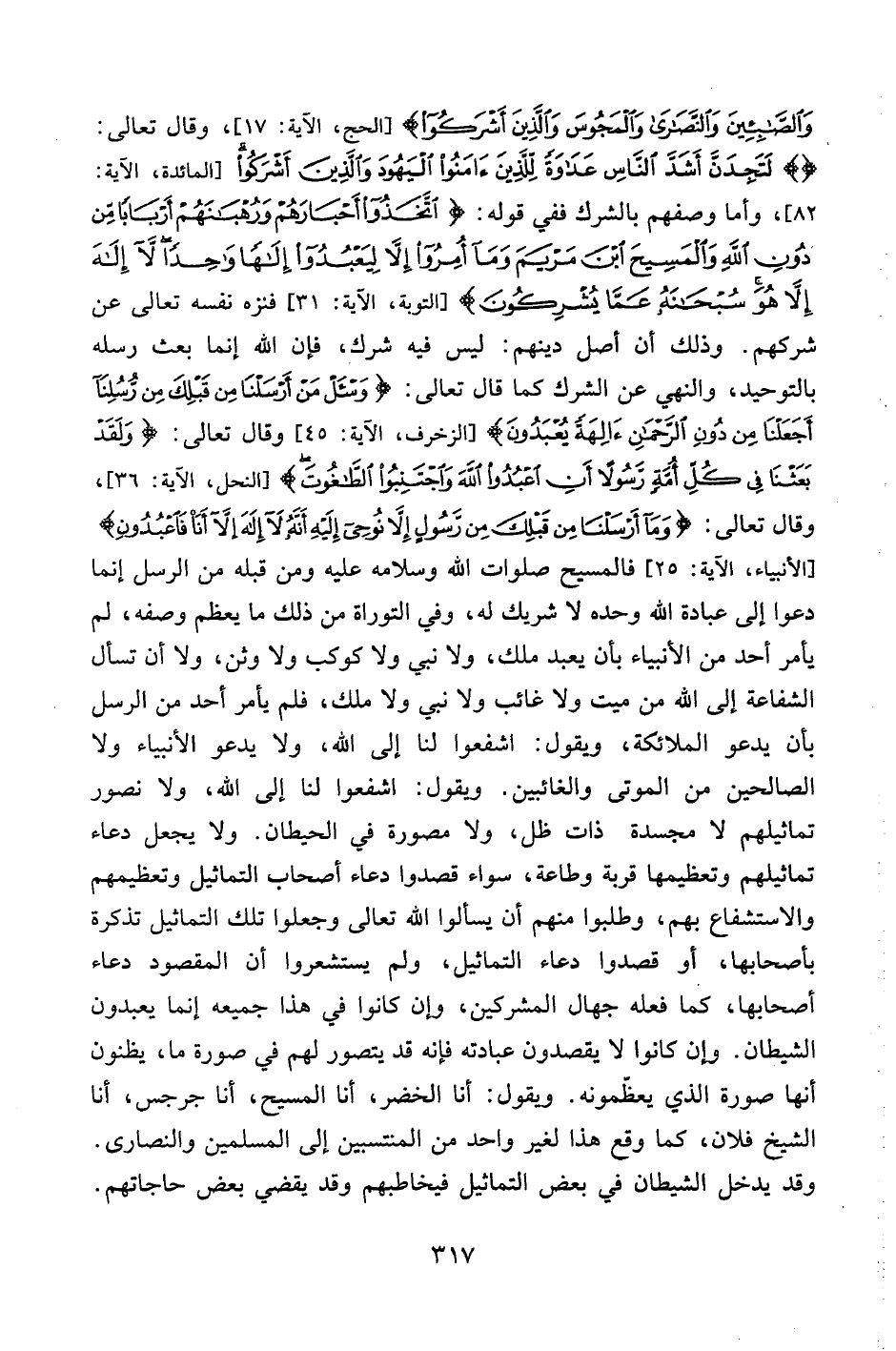 وَالصَّابِئِينَ وَالنَّصَارَى وَالْمَجُوسَ وَالَّذِينَ أَشْرَكُوا} [الحج، الآية:17] ، وقال تعالى: {لَتَجِدَنَّ أَشَدَّ النَّاسِ عَدَاوَةً لِلَّذِينَ آمَنُوا الْيَهُودَ وَالَّذِينَ أَشْرَكُوا} [المائدة، الآية:82] ، وأما وصفهم بالشرك ففي قوله: {اتَّخَذُوا أَحْبَارَهُمْ وَرُهْبَانَهُمْ أَرْبَاباً مِنْ دُونِ اللَّهِ وَالْمَسِيحَ ابْنَ مَرْيَمَ وَمَا أُمِرُوا إِلَّا لِيَعْبُدُوا إِلَهاً وَاحِداً لا إِلَهَ إِلَّا هُوَ سُبْحَانَهُ عَمَّا يُشْرِكُونَ} [التوبة، الآية:31] فنزه نفسه تعالى عن شركهم. وذلك أن أصل دينهم: ليس فيه شرك، فإن الله إنما بعث رسله بالتوحيد، والنهي عن الشرك كما قال تعالى: {وَاسْأَلْ مَنْ أَرْسَلْنَا مِنْ قَبْلِكَ مِنْ رُسُلِنَا أَجَعَلْنَا مِنْ دُونِ الرَّحْمَنِ آلِهَةً يُعْبَدُونَ} [الزخرف، الآية:45] ، وقال تعالى: {وَلَقَدْ بَعَثْنَا فِي كُلِّ أُمَّةٍ رَسُولاً أَنِ اعْبُدُوا اللَّهَ وَاجْتَنِبُوا الطَّاغُوتَ} [النحل، الآية:36] ، وقال تعالى: {وَمَا أَرْسَلْنَا مِنْ قَبْلِكَ مِنْ رَسُولٍ إِلَّا نُوحِي إِلَيْهِ أَنَّهُ لا إِلَهَ إِلَّا أَنَا فَاعْبُدُونِ} [الأنبياء، الآية:25] فالمسيح صلوات الله وسلامه عليه ومن قبله من الرسل إنما دعوا إلى عبادة الله وحده لا شريك له، وفي التوراة من ذلك ما يعظم وصفه، لم يأمر أحد من الأنبياء بأن يعبد ملك، ولا نبي ولا كوكب ولا وثن، ولا أن تسأل الشفاعة إلى الله من ميت ولا غائب ولا نبي ولا ملك، فلم يأمر أحد من الرسل بأن يدعو الملائكة، ويقول: اشفعوا لنا إلى الله، ولا يدعو الأنبياء ولا الصالحين من الموتى والغائبين. ويقول: اشفعوا لنا إلى الله، ولا نصور تماثيلهم ولا مجسدة ذات ظل، ولا مصورة في الحيطان. ولا يجعل دعاء تماثيلهم وتعظيمها قربة وطاعة، وسواء قصدوا دعاء أصحاب التماثيل وتعظيمهم والاستشفاع بهم، وطلبوا منهم أن يسألوا الله تعالى وجعلوا تلك التماثيل تذكرة بأصحابها، أو قصدوا دعاء التماثيل، ولم يستشعروا أن المقصود دعاء أصحابها، كما فعله جهال المشركين، وإن كانوا في هذا جميعه إنما يعبدون الشيطان. وإن كانوا لا يقصدون عبادته فإنه قد يتصور لهم في صورة ما، يظنون أنها صورة الذي يعظّمونه. ويقول: أنا الخضر، أنا المسيح، أنا جرجس، أنا الشيخ فلان، كما وقع هذا لغير واحد من المنتسبين إلى المسلمين والنصارى. وقد يدخل الشيطان في بعض التماثيل فيخاطبهم وقد يقضي بعض حاجاتهم.