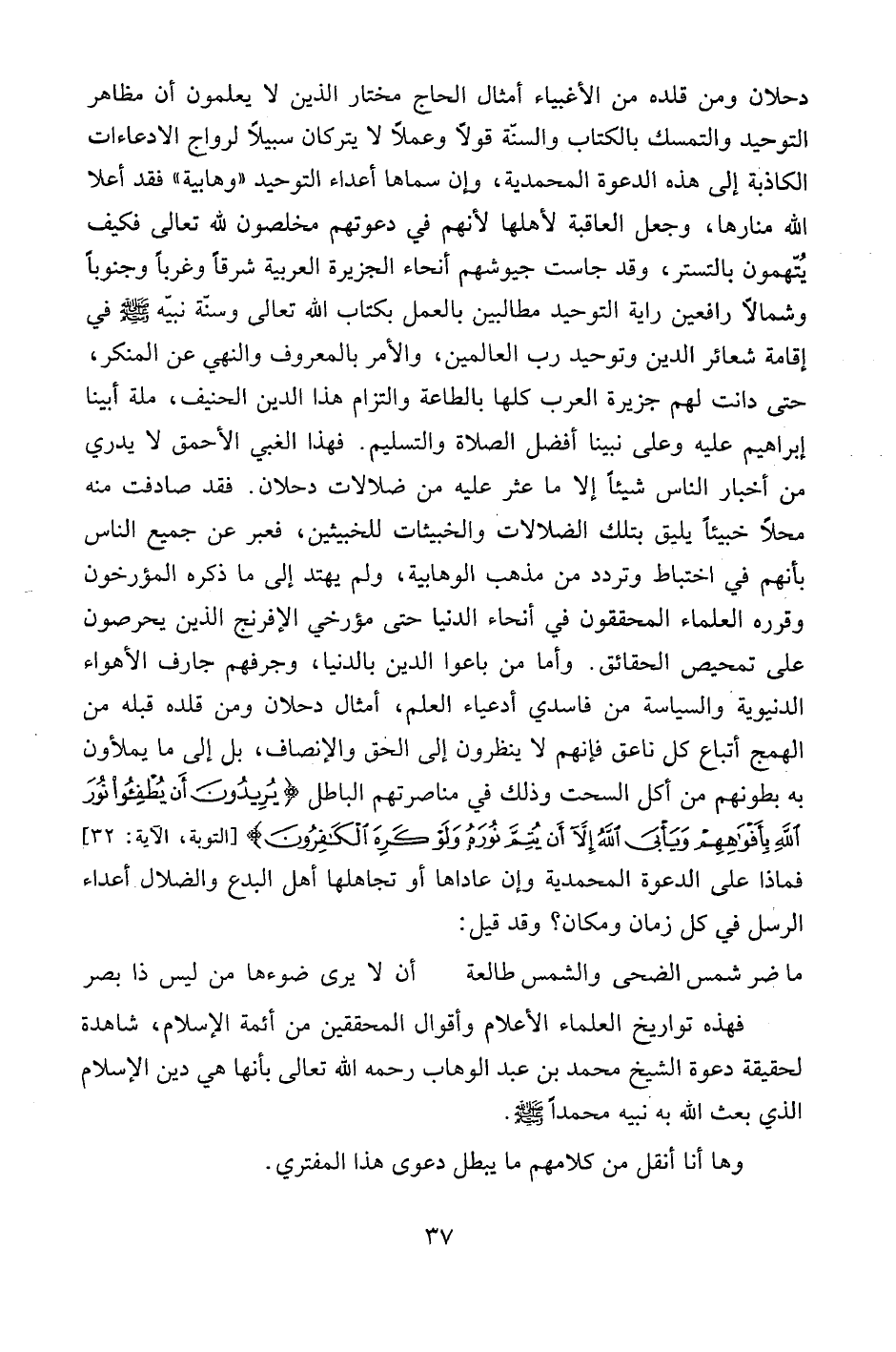 دحلان ومن قلده من الأغبياء أمثال الحاج مختار الذين لا يعلمون أن مظاهر التوحيد والتمسك بالكتاب والسنة قولاً وعملاً لا يتركان سبيلاً لرواج الادعاءات الكاذبة إلى هذه الدعوة المحمدية، وإن سماها أعداء التوحيد "وهابية" فقد أعلا الله منارها، وجعل العاقبة لأهلها لأنهم في دعوتهم مخلصون لله تعالى فكيف يتهمون بالتستر، وقد جاست جيوشهم أنحاء الجزيرة العربية شرقاً وغرباً وجنوباً وشمالاً رافعين راية التوحيد مطالبين بالعمل بكتاب الله تعالى وسنة نبيه صلى الله عليه وسلم في إقامة شعائر الدين وتوحيد رب العالمين، والأمر بالمعروف والنهي عن المنكر، حتى دانت لهم جزيرة العرب كلها بالطاعة والتزام هذا الدين الحنيف، ملة أبينا إبراهيم عليه وعلى نبينا أفضل الصلاة والتسليم. فهذا الغبي الأحمق لا يدري من أخبار الناس شيئاً إلى ما عثر عليه من ضلالات دحلان. فقد صادفت منه محلاً خبيئاً يليق بتلك الضلالات والخبيثات للخبيثين، فعبر عن جميع الناس بأنهم في اختباط وتردد من مذهب الوهابية، ولم يهتد إلى ما ذكره المؤرخون وقرره العلماء المحققون في أنحاء الدنيا حتى مؤرخي الإفرنج الذين يحرصون على تمحيص الحقائق. وأما من باعوا الدين بالدنيا، وجرفهم جارف الأهواء الدنيوية والسياسة من فاسدي أدعياء العلم، أمثال دحلان ومن قلده قبله من الهمج أتباع كل ناعق فإنهم لا ينظرون إلى الحق والإنصاف، بل إلى ما يملأون به بطونهم من أكل السحت وذلك في مناصرتهم الباطل {يُرِيدُونَ أَنْ يُطْفِئُوا نُورَ اللَّهِ بِأَفْوَاهِهِمْ وَيَأْبَى اللَّهُ إِلَّا أَنْ يُتِمَّ نُورَهُ وَلَوْ كَرِهَ الْكَافِرُونَ} [التوبة، الآية: 32] فماذا على الدعوة المحمدية وإن عاداها أو تجاهلها أهل البدع والضلال أعداء الرسل في كل زمان ومكان؟ وقد قيل: