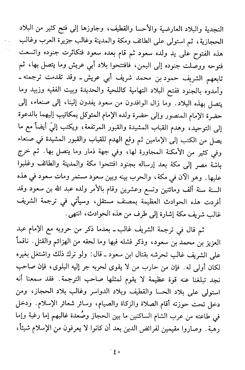 ثم قال في ترجمة الشريف غالب – بعد ما ذكر من حروبه مع الإمام عبد العزيز بن محمد بن سعود، وذكر فشله فيها وما لحقه من الهزائم والقتل. ناقماً على الشريف غالب تحرشه بقتال ابن سعود – قال: ولو ترك ذلك واشتغل بغيره لكان أولى له. فإن من حارب من لا يقوى لحربه جر إليه البلوى، فإن صاحب نجد تبلغنا عنه قوة عظيمة لا يقوم لمثلها صاحب الترجمة. فقد سمعنا أنه استولى على بلاد الحسا والقطيف وبلاد الدواسر وغالب بلاد الحجاز، ومن دخل تحت حوزته أقام الصلاة والزكاة والصيام، وسائر شعائر الإسلام. ودخل في طاعته من عرب الشام الساكنين ما بين الحجاز وصعدة غالبهم إما رغبة وإما رهبة. وصاروا مقيمين لفرائض الدين بعد أن كانوا لا يعرفون من الإسلام شيئاً،