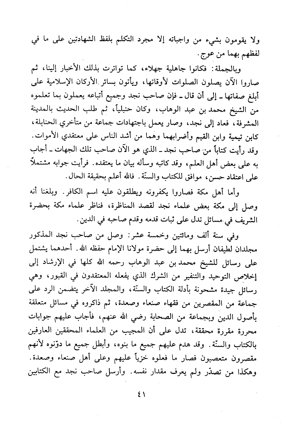 وبالجملة: فكانوا جاهلية جهلاء، كما تواترت بذلك الأخبار إلينا، ثم صاروا الآن يصلون الصلوات لأوقاتها، ويأتون بسائر الأركان الإسلامية على أبلغ صفاتها – إلى أن قال – فإن صاحب نجد وجميع أتباعه يعملون بما تعلموه من الشيخ محمد بن عبد الوهاب، كان حنبلياً، ثم طلب الحديث بالمدينة المشرفة، فعاد إلى نجد، وصار يعمل باجتهادات جماعة من متأخري الحنابلة، كابن تيمية وابن القيم وأضرابهما وهما من أشد الناس على معتقدي الأموات.