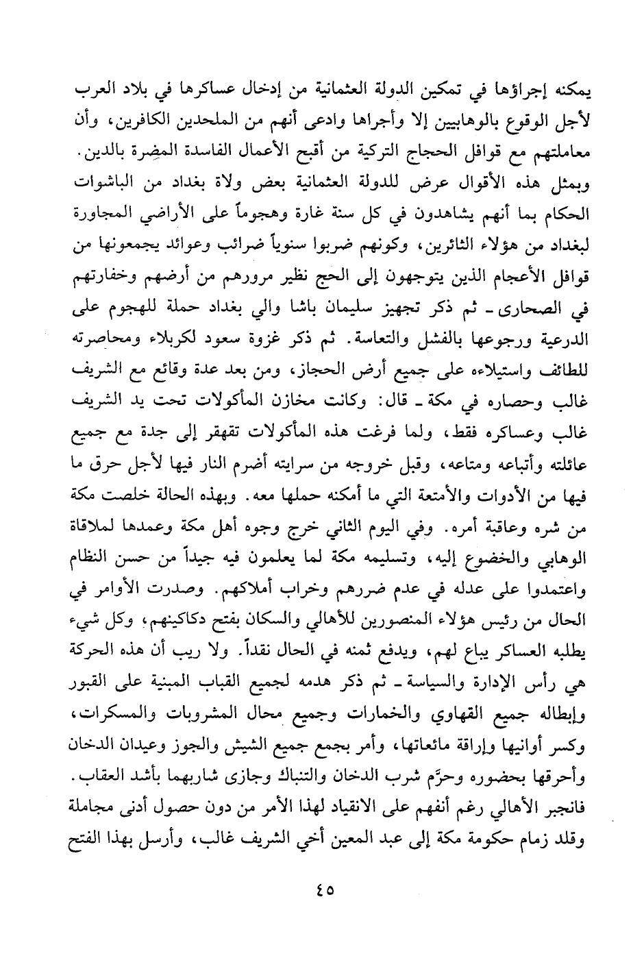 يمكنه إجراؤها في تمكين الدولة العثمانية من إدخال عساكرها في بلاد العرب لأجل الوقوع بالوهابيين إلا وأجراها وادعى أنهم من الملحدين الكافرين، وأن معاملتهم مع قوافل الحجاج التركية من أقبح الأعمال الفاسدة المضرة بالدين. وبمثل هذه الأقوال عرض للدولة العثمانية بعض ولاة بغداد من الباشوات الحكام بما أنهم يشاهدون في كل سنة غارة وهجوماً على الأراضي المجاورة لبغداد من هؤلاء الثائرين، وكونهم ضربوا سنوياً ضرائب وعوائد يجمعونها من قوافل الأعجام الذين يتوجهون إلى الحج نظير مرورهم من أرضهم وخفارتهم في الصحارى – ثم ذكر تجهيز سليمان باشا والي بغداد حملة للهجوم على الدرعية ورجوعها بالفشل والتعاسة. ثم ذكر غزوة سعود لكربلاء ومحاصرته للطائف واستيلاءه على جميع أرض الحجاز، ومن بعد عدة وقائع مع الشريف غالب وحصاره في مكة – قال: وكانت مخازن المأكولات تحت يد الشريف غالب وعساكره فقط، ولما فرغت هذه المأكولات تقهقر إلى جدة مع جميع عائلته وأتباعه ومتاعه، وقبل خروجه من سرايته أضرم النار فيها لأجل حرق ما فيها من الأدوات والأمتعة التي ما أمكنه حملها معه. وبهذه الحالة خلصت مكة من شره وعاقبة أمره. وفي اليوم الثاني خرج وجوه أهل مكة وعمدها لملاقاة الوهابي والخضوع إليه، وتسليمه مكة لما يعلمون فيه جيداً من حسن النظام واعتمدوا على عدله في عدم ضررهم وخراب أملاكهم. وصدرت الأوامر في الحال من رئيس هؤلاء المنصورين للأهالي والسكان بفتح دكاكينهم، وكل شيء يطلبه العساكر يباع لهم، ويدفع ثمنه في الحال نقداً. ولا ريب أن هذه الحركة هي رأس الإدارة والسياسة – ثم ذكر هدمه لجميع القباب المبنية على القبور وإبطاله جميع القهاوي والخمارات وجميع محال المشروبات والمسكرات، وكسر أوانيها وإراقة مائعاتها، وأمر بجمع الشيش والجوز وعيدان الدخان وأحرقها بحضوره وحرم شرب الدخان والتنباك وجازى شاربهما بأشد العقاب. فانجبر الأهالي رغم أنفهم على الانقياد لهذا الأمر من دون حصول أدنى مجاملة وقلد زمام حكومة مكة إلى عبد المعين أخي الشريف غالب، وأرسل بهذا الفتح