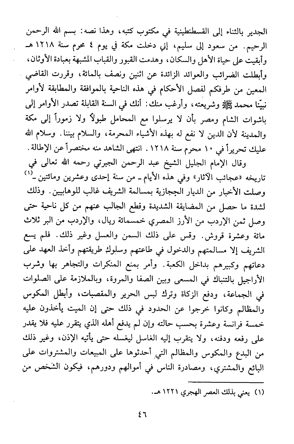 الجدير بالثناء إلى القسطنطينية في مكتوب كتبه، وهذا نصه: بسم الله الرحمن الرحيم. من سعود إلى سليم، إني دخلت مكة في يوم 4 محرم سنة 1218هـ وأبقيت على حياة الأهل والسكان، وهدمت القبور والقباب المشبهة بعبادة الأوثان، وأبطلت الضرائب والعوائد الزائدة عن اثنين ونصف بالمائة، وقررت القاضي المعين من طرفكم لفصل الأحكام في هذه الناحية بالموافقة والمطابقة لأوامر نبينا محمد صلى الله عليه وسلم وشريعته، وأرغب منك: أنك في السنة القابلة تصدر الأوامر إلى باشوات الشام ومصر بأن لا يرسلوا مع المحامل طبولاً ولا زموراً إلى مكة والمدينة لأن الدين لا نفع له بهذه الأشياء المحرمة، والسلام بيننا. وسلام الله عليك تحريراً في 10 محرم سنة 1218. انتهى الشاهد منه مختصراً عن الإطالة.