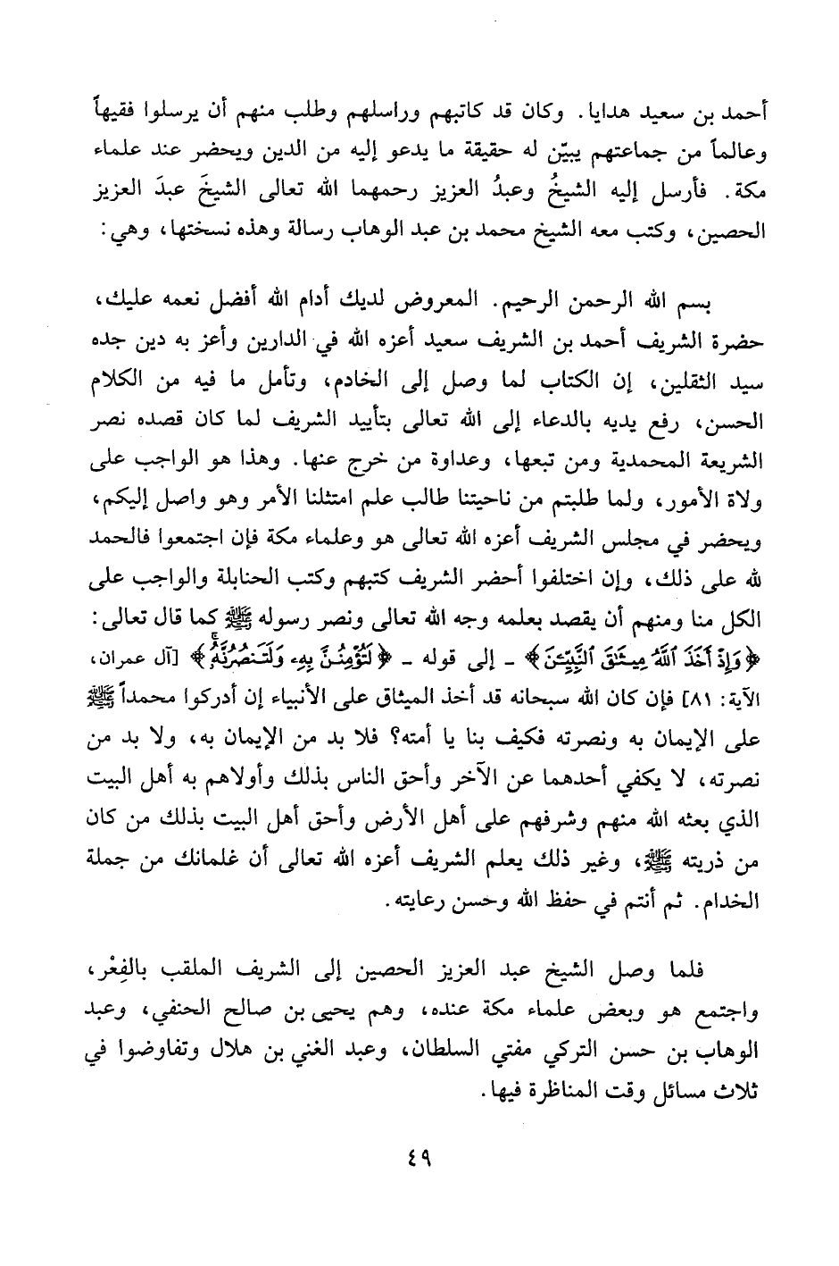 بسم الله الرحمن الرحيم. المعروض لديك أدام الله أفضل نعمه عليك، حضرة الشريف أحمد بن الشريف سعيد أعزه الله في الدراين وأعز به دين جده سيد الثقلين، إن الكتاب لما وصل إلى الخادم، وتأمل ما فيه من الكلام الحسن، رفع يديه بالدعاء إلى الله تعالى بتأييد الشريف لما كان قصده نصر الشريعة المحمدية ومن تبعها، وعداوة من خرج عنها. وهذا هو الواجب على ولاة الأمور، ولما طلبتم من ناحيتنا طالب علم امتثلنا الأمر وهو واصل إليكم، ويحضر في مجلس الشريف أعزه الله تعالى هو وعلماء مكة فإن اجتمعوا فالحمد لله على ذلك، وإن اختلفوا أحضر الشريف كتبهم وكتب الحنابلة والواجب على الكل منها ومنهم أن يقصد بعلمه وجه الله تعالى ونصر رسوله صلى الله عليه وسلم كما قال تعالى: