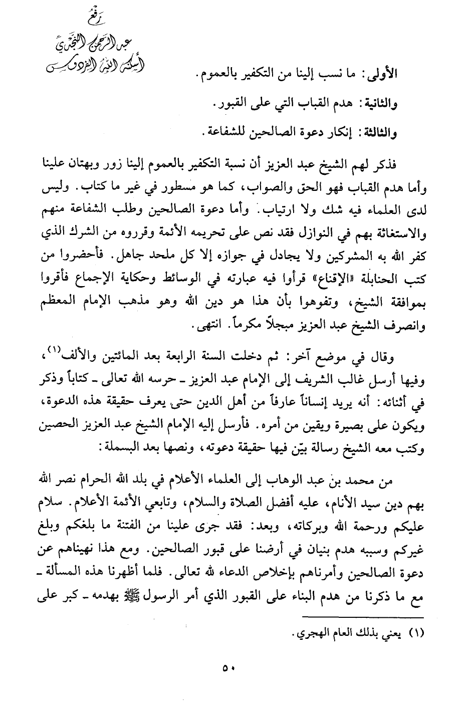 من محمد بن عبد الوهاب إلى العلماء الأعلام في بلد الله الحرام نصر الله بهم دين سيد الأنام، عليه أفضل الصلاة والسلام، وتابعي الأئمة الأعلام. سلام عليكم ورحمة الله وبركاته، وبعد: فقد جرى علينا من الفتنة ما بلغكم وبلغ غيركم وسببه هدم بنيان في أرضنا على قبور الصالحين. ومع هذا نهيناهم عن دعوة الصالحين وأمرناهم بإخلاص الدعاء لله تعالى. فلما أظهرنا هذه المسألة – مع ما ذكرنا من هدم البناء على القبور الذي أمر الرسول صلى الله عليه وسلم بهدمه – كبر على