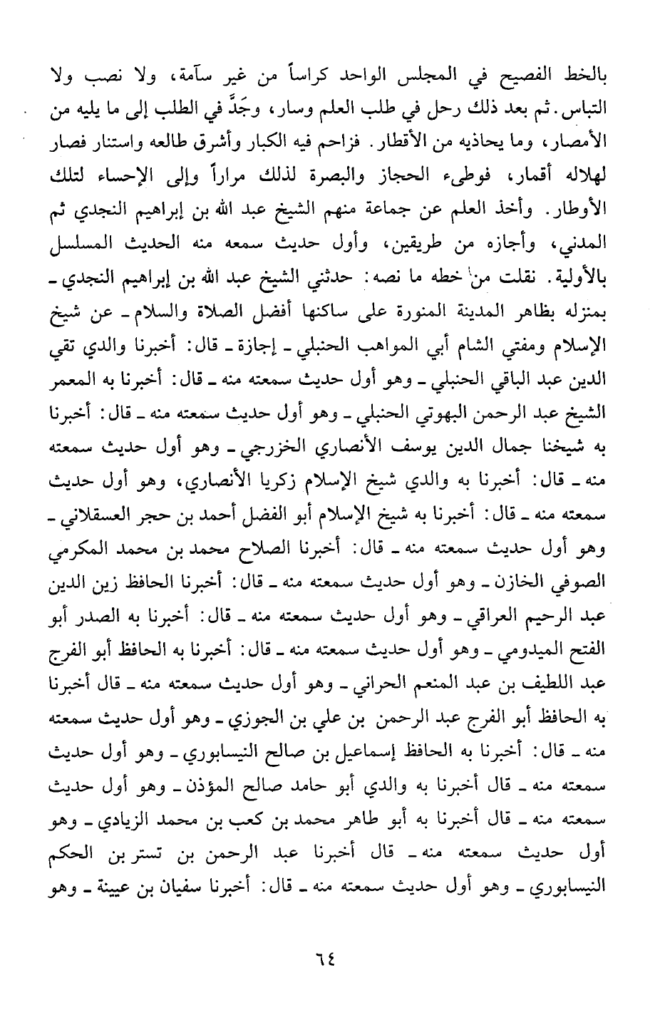 بالخط الفصيح في المجلس الواحد كراساً من غير سآمة، ولا نصب ولا التباس. ثم بعد ذلك رحل في طلب العلم وسار، وجد في الطلب إلى ما يليه من الأمصار، وما يحاذيه من الأقطار. فزاحم فيه الكبار وأشرق طالعه واستنار فصار لهلاله أقمار، فوطئ الحجاز والبصرة لذلك مراراً وإلى الإحساء لتلك الأوطار. وأخذ العلم عن جماعة منهم الشيخ عبد الله بن إبراهيم النجدي ثم المدني، وأجازه من طريقين، وأول حديث سمعه منه الحديث المسلسل بالأولية. نقلت من خطه ما نصه: حدثني الشيخ عبد الله بن إبراهيم النجدي – بمنزله بظاهر المدينة المنورة على ساكنها أفضل الصلاة والسلام – عن شيخ الإسلام ومفتي الشام أبي المواهب الحنبلي – إجازة – قال: أخبرنا والدي تقي الدين عبد الباقي الحنبلي – وهو اول حديث سمعته منه – قال: أخبرنا به المعمر الشيخ عبد الرحمن البهوتي الحنبلي – وهو أول حديث سمعته منه – قال: أخبرنا به شيخنا جمال الدين يوسف الأنصاري الخزرجي – وهو أول حديث سمعته منه – قال: أخبرنا به والدي شيخ الإسلام زكريا الأنصاري، وهو أول حديث سمعته منه – قال: أخبرنا به شيخ الإسلام أبو الفضل أحمد بن حجر العسقلاني – وهو أول حديث سمعته منه – قال: أخبرنا الصلاح محمد بن محمد المكرمي الصوفي الخازن – وهو أول حديث سمعته منه – قال: اخبرنا الحافظ زين الدين عبد الرحيم العراقي – وهو أول حديث سمعته منه – قال: أخبرنا به الصدر أبو الفتح الميدومي – وهو أول حديث سمعته منه – قال: أخبرنا به الحافظ أبو الفرج عبد اللطيف بن عبد المنعم الحراني – وهو أول حديث سمعته منه – قال: أخبرنا به الحافظ أبو الفرج بن عبد الرحمن بن علي بن الجوزي – وهو أول حديث سمعته منه – قال: أخبرنا به الحافظ إسماعيل بن صالح النيسابور – وهو أول حديث سمعته منه – قال: أخبرنا به أبو حامد صالح المؤذن – وهو أول حديث سمعته منه – قال أخبرنا به أبو طاهر محمد بن كعب بن محمد الزيادي - وهو أول حديث سمعته منه – قال أخبرنا عبد الرحمن بن تستر بن الحكم النيسابوري – وهو أول حديث سمعته منه – قال: أخبرنا سفيان بن عيينة – وهو