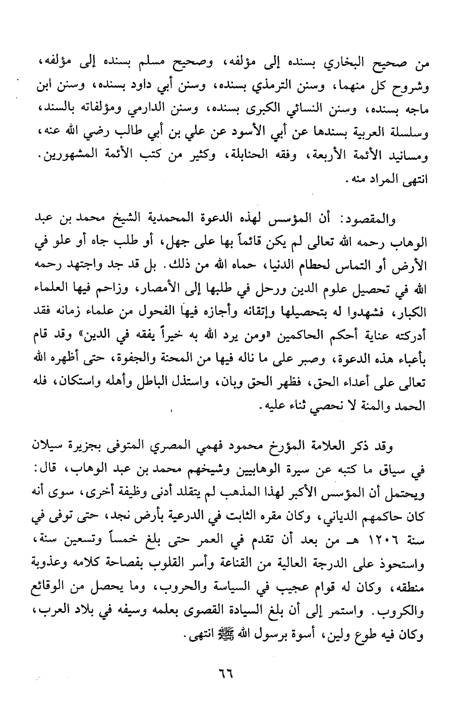 والمقصود: أن المؤسس لهذه الدعوة المحمدية الشيخ محمد بن عبد الوهاب رحمه الله تعالى لم يكن قائماً بها على جهل، أو طلب جاه أو علو في الأرض أو التماس لحطام الدنيا، حماه الله من ذلك. بل قد جد واجتهد رحمه الله في تحصيل علو الدين ورحل في طلبها إلى الأمصار، وزاحم فيها العلماء الكبار، فشهدوا له بتحصيلها وإتقانه وأجازه فيها الفحول من علماء زمانه فقد أدركته عناية أحكم الحاكمين "ومن يرد الله به خيراً يفقه في الدين" وقد قام بأعباء هذه الدعوة، وصبر على ما ناله فيها من المحنة والجفوة، حتى أظهره الله تعالى على أعداء الحق، فظهر الحق وبان، واستذل الباطل وأهله واستكان، فله الحمد والمنة لا نحصي ثناء عليه.