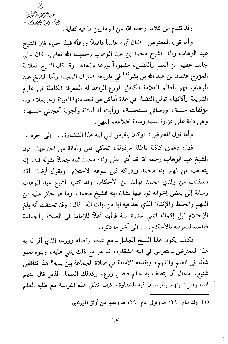 وأما قول المعترض: "وكان يتفرس في ابنه هذا الشقاوة. . . إلى آخره". فهذه دعوى كاذبة باطلة مرذولة، تحكي دين وأمانة من اخترعها. فإن الشيخ عبد الوهاب رحمه الله قد أثنى على ولده محمد ثناء جميلاً بقوله فيه: إنه يتعجب من فهم ابنه محمد وإدراكه قبل بلوغه الاحتلام. ويقول أيضاً: لقد استفدت من ولدي محمد فوائد من الأحكام. وقد كتب الشيخ عبد الوهاب رسالة إلى بعض إخوانه نوه فيها بشأن ابنه الشيخ محمد، وما هو حائز عليه من الفهم والحفظ والإتقان الذي يعد فيه آية من آيات الله. قال: وقد تحققت أنه بلغ الاحتلام قبل إكماله اثنتي عشرة سنة فرأيته أهلاً للإمامة في الصلاة بالجماعة فقدمته لمعرفته بالأحكام. . . إلى آخر ما ذكره.