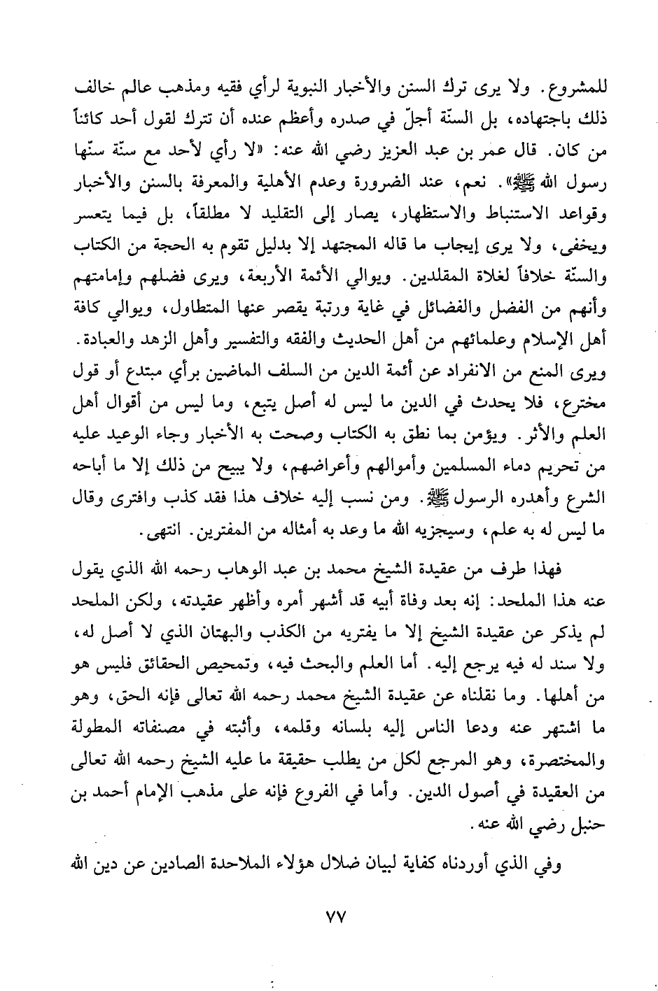 للمشروع. ولا يرى ترك السنن والأخبار النبوية لرأي فقيه ومذهب عالم خالف ذلك باجتهاده، بل السنة أجل في صدره وأعظم عنده أن تترك لقول أحد كائناً من كان. قال عمر بن عبد العزيز رضي الله عنه: "لا رأي لأحد مع سنة سنها رسول الله صلى الله عليه وسلم". نعم، عند الضرورة وعدم الأهلية والمعرفة بالسنن والأخبار وقواعد الاستنباط والاستظهار، يصار إلى التقليد لا مطلقاً، بل فيما يتعسر ويخفى، ولا يرى إيجاب ما قاله المجتهد إلى بدليل تقوم به الحجة من الكتاب والسنة خلافاً لغلاة المقلدين. ويوالي الأئمة الأربعة، ويرى فضلهم وإمامتهم وأنهم من الفضل والفضائل في غاية ورتبة يقصر عنها المتطاول، ويوالي كافة أهل الإسلام وعلمائهم من أهل الحديث والفقه والتفسير وأهل الزهد والعبادة. ويرى المنع من الانفراد عن أئمة الدين من السلف الماضين برأي مبتدع أو قول مخترع، فلا يحدث في الدين ما ليس له أصل يتبع، وما ليس من أقوال أهل العلم والأثر. ويؤمن بما نطق به الكتاب وصحت به الأخبار وجاء الوعيد عليه من تحريم دماء المسلمين وأموالهم وأعراضهم، ولا يبيح من ذلك إلا ما جاء أباحه الشرع وأهدره الرسول صلى الله عليه وسلم. ومن نسب إليه خلاف هذا فقد كذب وافترى وقال ما ليس له به علم، وسيجزيه الله ما وعد به أمثاله من المفترين. انتهى.