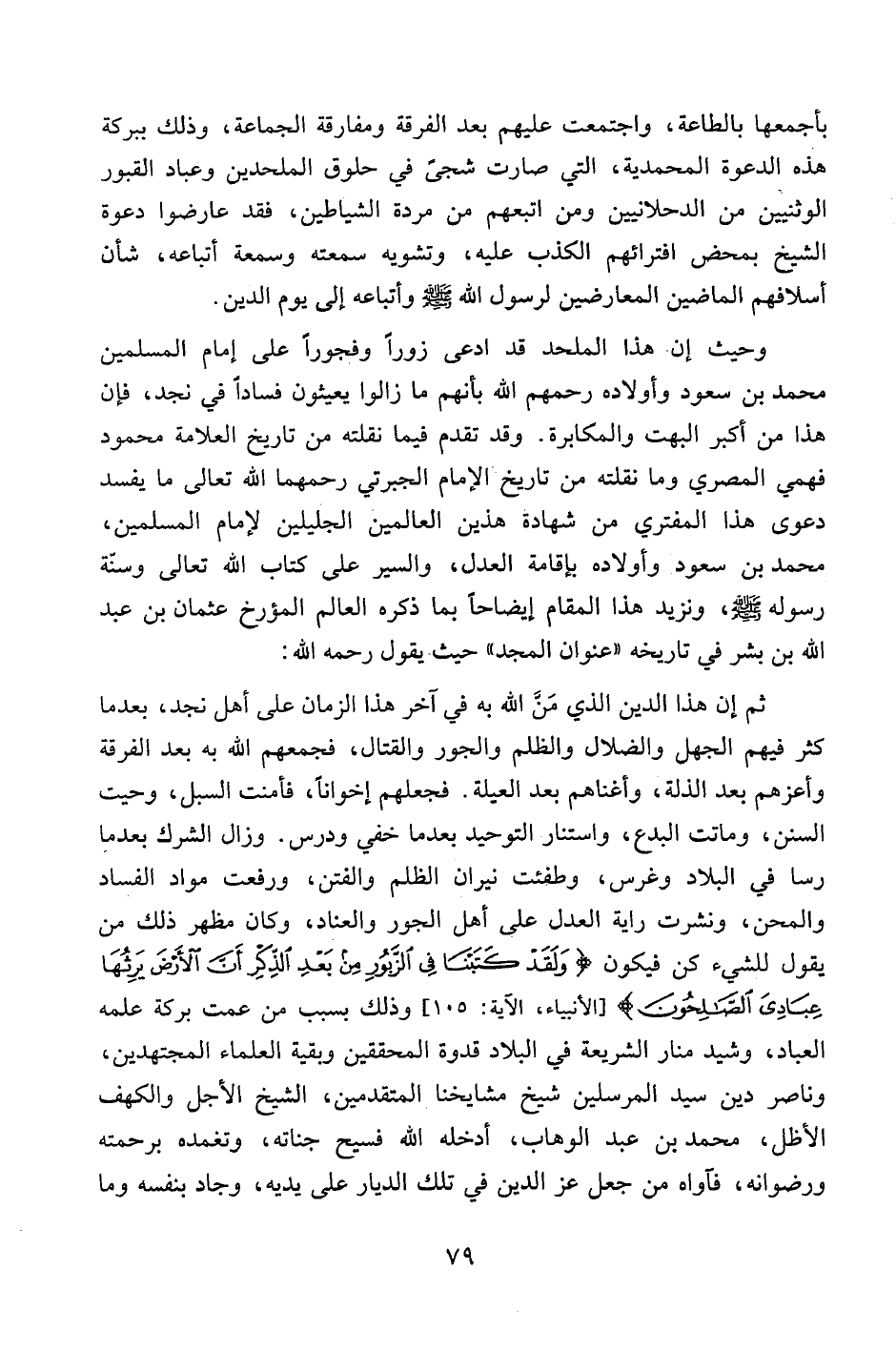 ثم إن هذا الدين الذي منَّ الله به في آخر هذا الزمان على أهل نجد، بعدما كثر فيهم الجهل والضلال والضلم والجور والقتال، فجمعهم إخواناً، فأمنت السبل، وحيث السنن، وماتت البدع، واستنار التوحيد بعدما خفي ودرس. وزال الشرك بعدما رسا في البلاد وغرس، وطفئت نيران الظلم والفتن، ورفعت مواد الفساد والمحن، ونشرت راية العدل على أهل الجور والعناد، وكان مظهر ذلك من يقول للشيء كن فيكون {وَلَقَدْ كَتَبْنَا فِي الزَّبُورِ مِنْ بَعْدِ الذِّكْرِ أَنَّ الْأَرْضَ يَرِثُهَا عِبَادِيَ الصَّالِحُونَ} [الأنبياء، الآية:105] وذلك بسبب من عمت بركة علمه العباد، وشيد منار الشريعة في البلاد قدوة المحققين وبقية العلماء المجتهدين، وناصر دين سيد المرسلين شيخ مشايخنا المتقدمين، الشيخ الأجل والكهف الأظل، محمد بن عبد الوهاب، أدخله الله فسيح جناته، وتغمده برحمته ورضوانه، فآواه من جعل عز الدين في تلك الديار على يديه، وجاد بنفسه وما