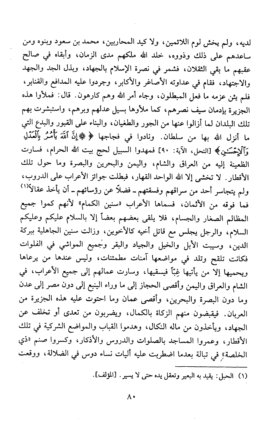 لديه، ولم يخش لوم اللائمين، ولا كيد المحاربين، محمد بن سعود وبنوه ومن ساعدهم على ذلك وذووه، خلد الله ملكهم مدى الزمان، وأبقاه في صالح عقبهم ما بقي الثقلان، فشمر في نصرة الإسلام بالجهاد، وبذل الجد والجهد والاجتهاد، فقام في عداوته الأصاغر والأكابر، وجردوا عليه المدافع والقنابر، فلم يثن عزمه ما فعل المبطلون، وجاء أمر الله وهم كارهون. قال: فملأوا هذه الجزيرة بإدمان سيف نصرهم، كما ملأوها بسيل عدلهم وبرهم، واستبشرت بهم تلك البلدان لما أزالوا عنها من الجور والطغيان، والبناء على القبور والبدع التي ما أنزل الله بها من سلطان. ونادوا في فجاجها {إِنَّ اللَّهَ يَأْمُرُ بِالْعَدْلِ وَالْأِحْسَانِ} [النحل، الآية: 90] فمهدوا السبيل لحج بيت الله الحرام، فسارت الظعينة إليه من العراق والشام، واليمن والبحرين والبصرة وما حول تلك الأقطار. لا تخشى إلا الله الواحد القهار، فبطلت جوائز الأعراب على الدروب، ولم يتجاسر أحد من سراقهم وفسقتهم – فضلاً عن رؤسائهم – أن يأخذ عقالاً (1) فما فوقه من الأثمان، فسماها الأعراب "سنين الكمام" لأنهم كموا جميع المظالم الصغار والجسام، فلا يلقى بعضهم بعضاً إلا بالسلام عليكم وعليكم السلام، والرجل يجلس مع قاتل أخيه كالأخوين، وزالت سنين الجاهلية ببركة الدين، وسيبت الأبل والخيل والجياد والبقر وجميع المواشي في الفلوات فكانت تلقح وتلد في مواضعها آمنات مطمئنات، وليس عندها من يرعاها ويحميها إلا من يأتيها غبا فيسقيها، وسارت عمالهم إلى جميع الأعراب، في الشام والعراق واليمن وأقصى الحجاز إلى ما وراء الينبع إلى دون مصر إلى عدن وما دون البصره والبحرين، وأقصى عمان وما احتوت عليه هذه الجزيرة من العربان. فيقبضون منهم الزكاة بالكمال، ويضربون من تعدى أو تخلف عن الجهاد، ويأخذون من ماله النكال، وهدموا القباب والمواضع الشركية في تلك الأقطار، وعمروا المساجد بالصلوات والدروس والأذكار، وكسروا صنم "ذي الخلصة" في تبالة بعدما اضطربت عليه أليات نساء دوس في الضلالة، ورقعت