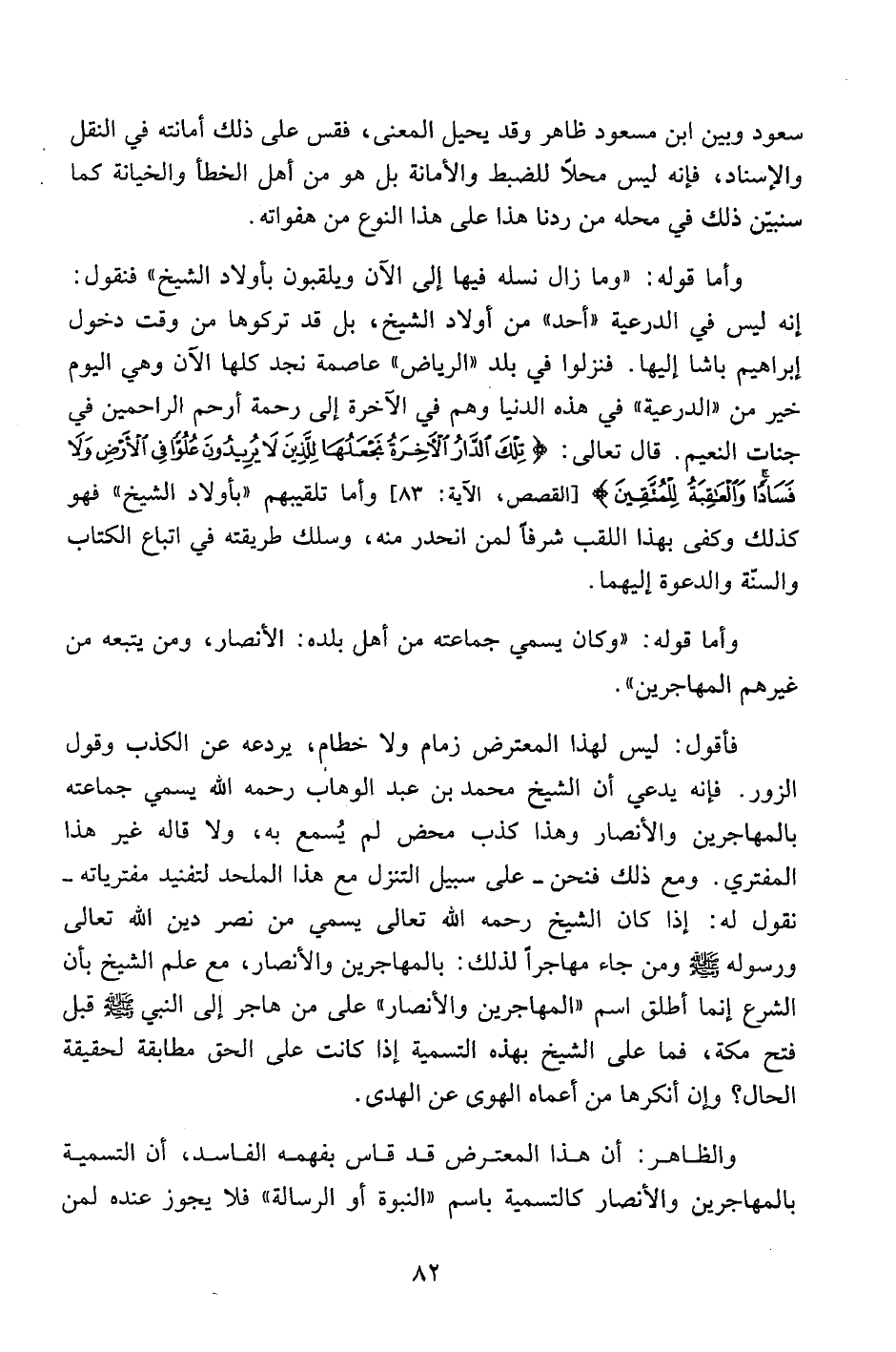 فأقول: ليس لهذا المعترض زمام ولا خطام، يردعه عن الكذب وقول الزور. فإنه يدعي أن الشيخ محمد بن عبد الوهاب رحمه الله يسمي جماعته بالمهاجرين والأنصار وهذا كذب محض لم يسمع به، ولا قاله غير هذا المفتري. ومع ذلك فنحن – على سبيل التنزل مع هذا الملحد لتفنيد مفترياته – نقول له: إذا كان الشيخ رحمه الله تعالى يسمي من نصر دين الله تعالى ورسوله صلى الله عليه وسلم ومن جاء مهاجراً لذلك: بالمهاجرين والأنصار، مع علم الشيخ بأن الشرع إنما أطلق اسم "المهاجرين والأنصار"على من هاجر إلى النبي صلى الله عليه وسلم قبل فتح مكة، فما على الشيخ بهذه التسمية إذا كانت على الحق مطابقة لحقيقة الحال؟ وإن أنكرها من أعماه الهوى عن الهدى.