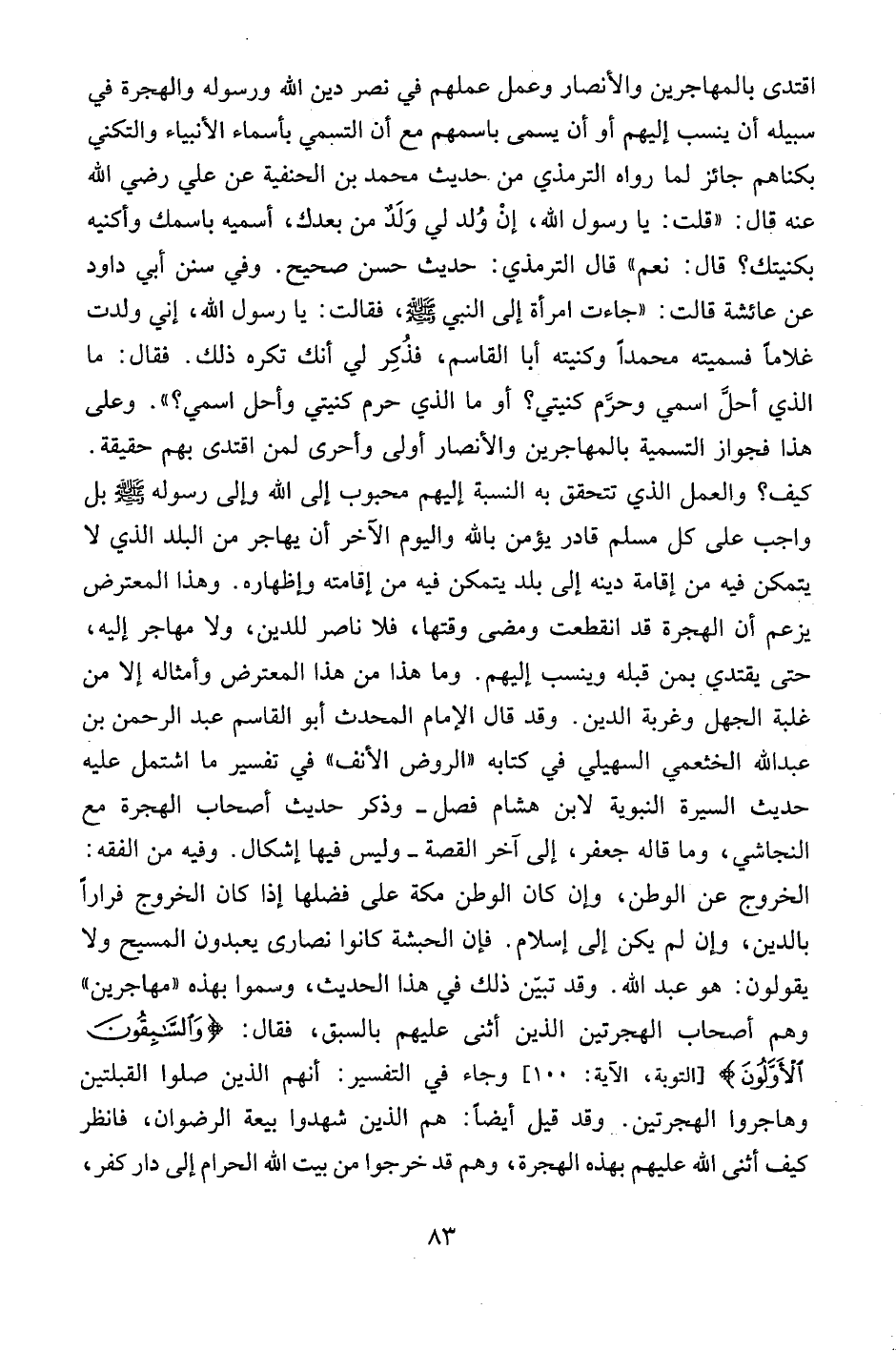 اقتدى بالمهاجرين والأنصار وعمل عملهم في نصر دين الله ورسوله والهجرة في سبيله أن ينسب إليهم أو أن يسمى باسمهم مع أن التسمي بأسماء الأنبياء والتكني بكناهم جائز لما رواه الترمذي من حديث محمد بن الحنفية عن علي رضي الله عنه قال: "قلت: يا رسول الله، إن ولد لي ولد من بعدك، أسميه باسمك وأكنيه بكنيتك؟ قال: نعم" قال الترمذي: حديث حسن صحيح. وفي سنن أبي داود عن عائشة قالت: "جاءت امرأة إلى النبي صلى الله عليه وسلم، فقالت: يا رسول الله، إني ولدت غلاماً فسميته محمداً وكنيته أبا القاسم، فذكر لي أنك تكره ذلك. فقال: ما الذي أحل اسمي وحرم كنيتي؟ أو ما الذي حرم كنيتي وأحل اسمي؟ ". وعلى هذا فجواز التسمية بالمهاجرين والأنصار أولى وأحرى لمن اقتدى بهم حقيقة. كيف؟ والعمل الذي تتحقق به النسبة إليهم محبوب على الله وإلى رسوله صلى الله عليه وسلم بل واجب على كل مسلم قادر يؤمن بالله واليوم الآخر أن يهاجر من البلد الذي لا يتمكن فيه من إقامة دينه إلى بلد يتمكن فيه من إقامته وإظهاره. وهذا المعترض يزعم أن الهجرة قد انقطعت ومضى وقتها، فلا ناصر للدين، ولا مهاجر إليه، حتى يقتدي بمن قبله وينسب إليهم. وما هذا من هذا المعترض وأمثاله إلا من غلبة الجهل وغربة الدين. وقد قال الإمام المحدث أبو القاسم عبد الرحمن بن عبد الله المخثعمي السهيلي في كتابه "الروض الأنف" في تفسير ما اشتمل عليه حديث السيرة النبوة لابن هشام فصل – وذكر حديث أصحاب الهجرة مع النجاشي، وما قاله جعفر، إلى آخر القصة – وليس فيها إشكال. وفيه من الفقه: الخروج عن الوطن، وإن كان الوطن مكة على فضلها إذا كان الخروج فراراً بالدين، وإن لم يكن إلى إسلام. فإن الحبشة كانوا نصارى يعبدون المسيح ولا يقولون: هو عبد الله. وقد تبين ذلك في هذا الحديث، وسموا بهذه "المهاجرين" وهم أصحاب الهجرتين الذين أثنى عليهم بالسبق، فقال: {وَالسَّابِقُونَ الْأَوَّلُونَ} [التوبة، الآية:100] وجاء في التفسير: أنهم الذين صلوا القبلتين وهاجروا الهجرتين. وقد قيل أيضاً: هم الذين شهدوا بيعة الرضوان، فانظر كيف أثنى الله عليهم بهذه الهجرة، وهم قد خرجوا من بيت الله الحرام إلى دار كفر،