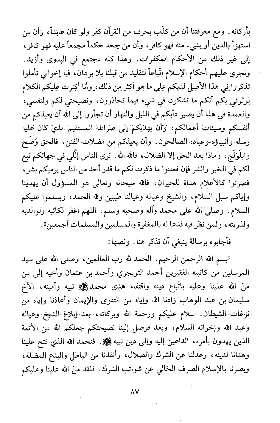 "بسم الله الرحمن الرحيم. الحمد لله رب العالمين، وصلى الله على سيد المرسلين من كاتبيه الفقيرين أحمد التويجري وأحمد بن عثمان وأخيه إلى من من الله علينا وعليه باتباع دينه واقتفاء هدى محمد صلى الله عليه وسلم نبيه وأمينه، الأخ سليمان بن عبد الوهاب زادنا الله وإياه من التقوى والإيمان وأعاذنا وإياه من نزغات الشيطان. سلام عليكم ورحمة الله وبركاته، بعد إبلاغ الشيخ وعياله وعبد الله وإخوانه السلام، وبعد فوصل إلينا نصيحتكم جعلكم الله من الأئمة الذين يهدون بأمره، الداعين إليه وإلى دين نبيه صلى الله عليه وسلم. فنحمد الله الذي فتح علينا وهدانا لدينه، وعدلنا عن الشرك والضلال، وأنقذنا من الباطل والبدع المضلة، وبصرنا بالإسلام الصرف الخالي عن شوائب الشرك. فلقد من الله علينا وعليكم
