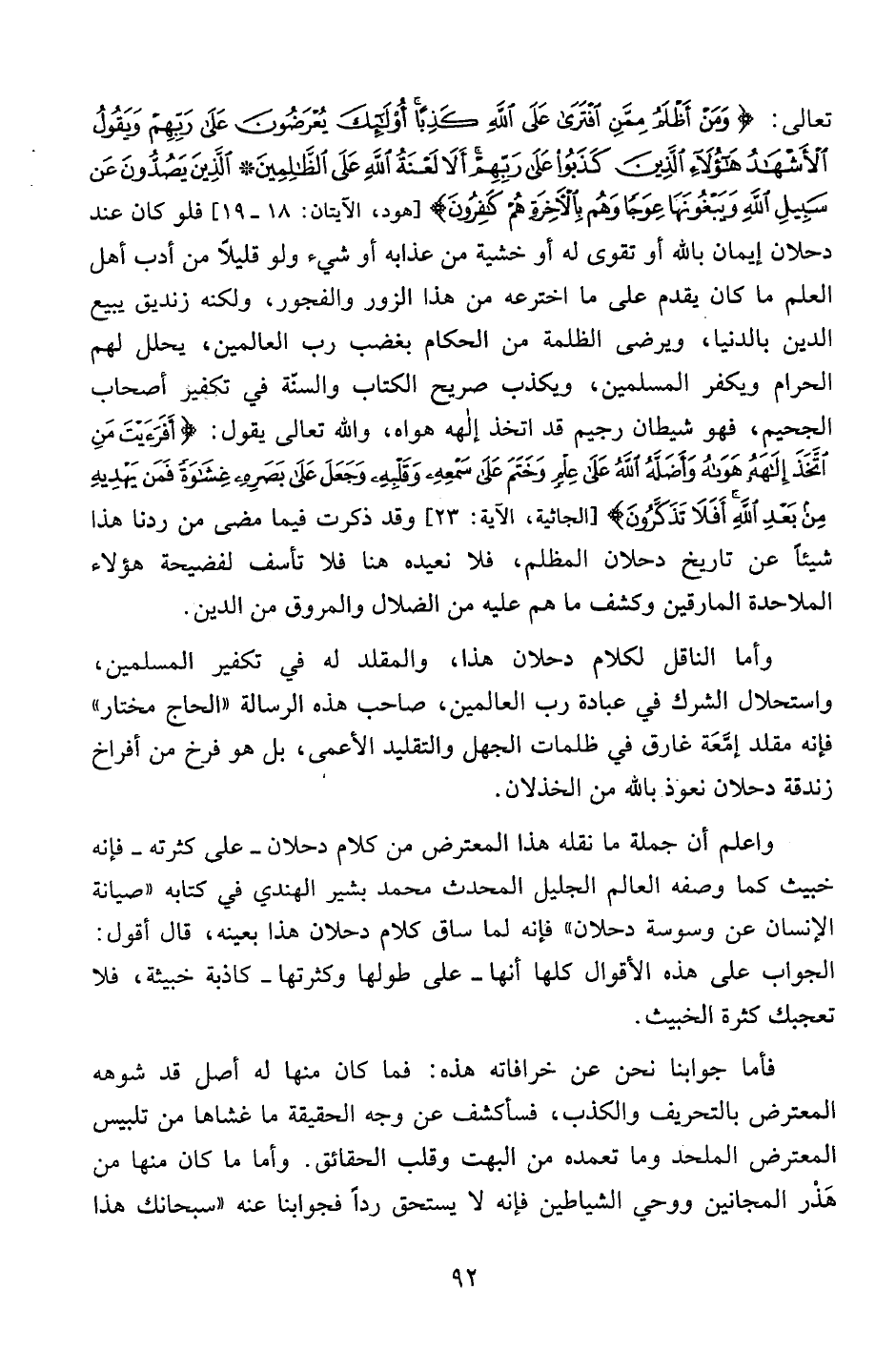 تعالى: {وَمَنْ أَظْلَمُ مِمَّنْ افْتَرَى عَلَى اللَّهِ كَذِباً أُوْلَئِكَ يُعْرَضُونَ عَلَى رَبِّهِمْ وَيَقُولُ الأَشْهَادُ هَؤُلاءِ الَّذِينَ كَذَبُوا عَلَى رَبِّهِمْ أَلا لَعْنَةُ اللَّهِ عَلَى الظَّالِمِينَ الَّذِينَ يَصُدُّونَ عَنْ سَبِيلِ اللَّهِ وَيَبْغُونَهَا عِوَجاً وَهُمْ بِالآخِرَةِ هُمْ كَافِرُونَ} [هود، الآيتان: 18- 19] فول كان عند دحلان إيمان بالله أو تقوى له أو خشية من عذابه أو شيء ولو قليلاً من أدب أهل العلم ما كان يقدم على ما اخترعه من هذا الزور والفجور، ولكنه زنديق يبيع الدين بالدنيا، ويرضى الظلمة من الحكام بغضب رب العالمين، يحلل لهم الحرام ويكفر المسلمين، ويكذب صريح الكتاب والسنة في تكفير أصحاب الجحيم، فهو شيطان رجيم قد اتخذ إلهه هواه، والله تعالى يقول: {أَفَرَأَيْتَ مَنِ اتَّخَذَ إِلَهَهُ هَوَاهُ وَأَضَلَّهُ اللَّهُ عَلَى عِلْمٍ وَخَتَمَ عَلَى سَمْعِهِ وَقَلْبِهِ وَجَعَلَ عَلَى بَصَرِهِ غِشَاوَةً فَمَنْ يَهْدِيهِ مِنْ بَعْدِ اللَّهِ أَفَلا تَذَكَّرُونَ} [الجاثية، الآية: 23] وقد ذكرت فيما مضى من ردنا هذا شيئاً عن تاريخ دحلان المظلم، فلا نعيده هنا فلا تأسف لفضيحة هؤلاء الملاحدة المارقين وكشف ما هم عليه من الضلال والمروق من الدين.