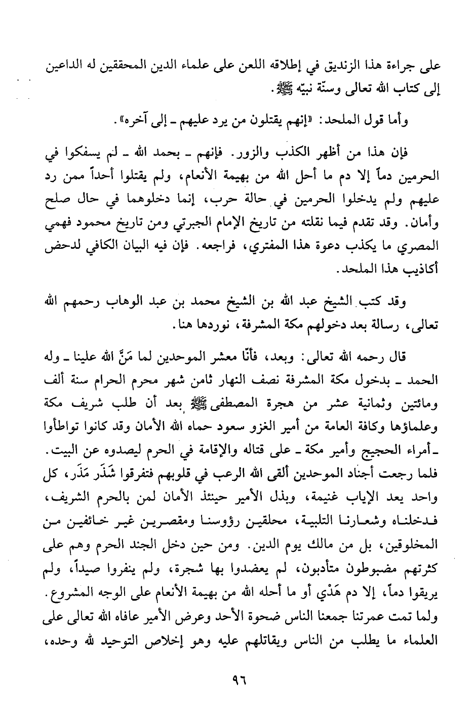فإن هذا من أظهر الكذب والزور. فإنهم – بحمد الله – لم يسفكوا في الحرمين دماً إلا دم ما أحل الله من بهيمة الأنعام، ولم يقتلوا أحداً ممن رد عليهم ولم يدخلوا الحرمين في حالة حرب، إنما دخلوهما في حال صلح وأمان. وقد تقدم فيما نقلته من تاريخ الإمام الجبرتي ومن تاريخ محمود فهمي المصري ما يكذب دعوة هذا المفتري، فراجعه. فإن فيه البيان الكافي لدحض أكاذيب هذا الملحد.
