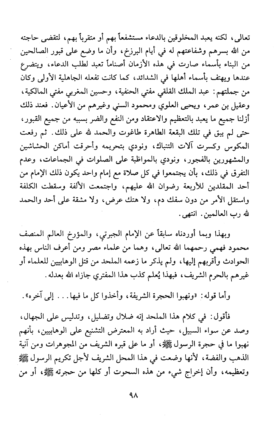 وبهذا وبما أوردناه سابقاً عن الإمام الجبرتي، والمؤرخ العالم المنصف محمود فهمي رحمهما الله تعالى، وهما من علماء مصر ومن أعرف الناس بهذه الحوادث وأقربهم إليها، ولم يذكر ما زعمه الملحد من قتل الوهابيين للعلماء أو غيرهم بالحرم الشريف، فبهذا يعلم كذب هذا المفتري جازاه الله بعدله.