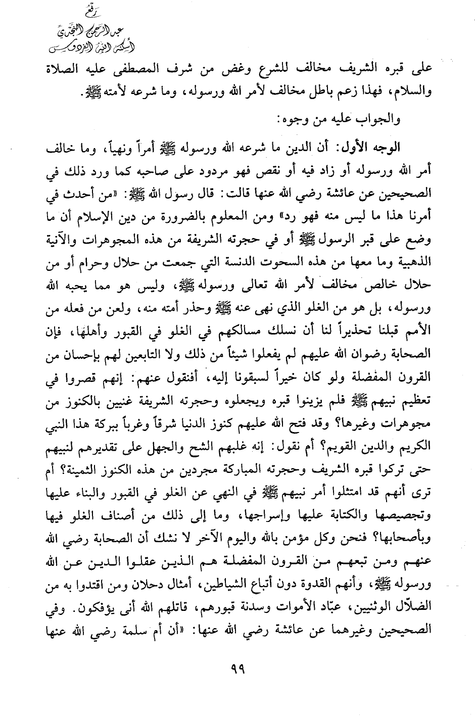 الوجه الأول: أن الدين ما شرعه الله ورسوله صلى الله عليه وسلم أمراً ونهياً، وما خالف أمر الله ورسوله أو زاد فيه أو نقص فهو مردود على صاحبه كما ورد ذلك في الصحيحين عن عائشة رضي الله عنها قالت: قال رسول الله صلى الله عليه وسلم: "من أحدث في أمرنا هذا ما ليس منه فهو رد" ومن المعلوم بالضرورة من دين الإسلام أن ما وضع على قبر الرسول صلى الله عليه وسلم أو في حجرته الشريفة من هذه المجوهرات والآنية الذهبية وما معها من هذه السحوت الدنسة التي جمعت من حلال وحرام أو من حلال خالص مخالف لأمر الله تعالى ورسوله صلى الله عليه وسلم، وليس هو مما يحبه الله ورسوله، بل هو من الغلو الذي نهى عنه صلى الله عليه وسلم وحذر أمته منه، ولعن من فعله من الأمم قبلنا تحذيراً لنا أن نسلك مسالكهم في الغلو في القبور وأهلها، فإن الصحابة رضوان الله عليهم لم يفعلوا شيئاً من ذلك ولا التابعين لهم بإحسان من القرون المفضلة ولو كان خيراً لسبقونا إليه، أفنقول عنهم: إنهم قصروا في تعظيم نبيهم صلى الله عليه وسلم فلم يزينوا قبره ويجعلوه وحجرته الشريفة غنيين بالكنوز من مجوهرات وغيرها؟ وقد فتح الله عليهم كنوز الدنيا شرقاً وغرباً ببركة هذا النبي الكريم والدين القويم؟ أم نقول: إنه غلبهم الشح والجهل على تقديرهم لنبيهم حتى تركوا قبره الشريف وحجرته المباركة مجردين من هذه الكنوز الثمينة؟ أم ترى أنهم قد امتثلوا أمر نبيهم صلى الله عليه وسلم في النهي عن الغلو في القبور والبناء عليها وتجصيصها والكتابة عليها وإسراجها، وما إلى ذلك من أصناف الغلو فيها وبأصحابها؟ فنحن وكل مؤمن بالله واليوم الآخر لا نشك أن الصحابة رضي الله عنهم ومن تبعهم من القرون المفضلة هم الذين عقلوا الدين عن الله ورسوله صلى الله عليه وسلم، وأنهم القدوة دون أتباع الشياطين، أمثال دحلان ومن اقتدوا به من الضلال الوثنيين، عباد الأموات وسدنة قبورهم، قاتلهم الله أني يؤفكون. وفي الصحيحين وغيرهما عن عائشة رضي الله عهنا: "أن أم سلمة رضي الله عنها