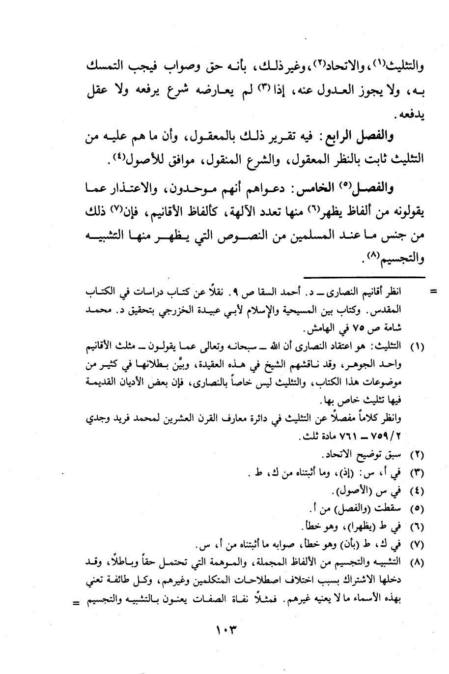 وَالْفَصْلُ الْخَامِسُ: دَعْوَاهُمْ أَنَّهُمْ مُوَحِّدُونَ، وَالِاعْتِذَارُ عَمَّا يَقُولُونَهُ مِنْ أَلْفَاظٍ يَظْهَرُ مِنْهَا تَعَدُّدُ الْآلِهَةِ، كَأَلْفَاظِ الْأَقَانِيمِ ; فَإِنَّ ذَلِكَ مِنْ جِنْسِ مَا عِنْدَ الْمُسْلِمِينَ مِنَ النُّصُوصِ الَّتِي يَظْهَرُ مِنْهَا التَّشْبِيهُ وَالتَّجْسِيمُ.