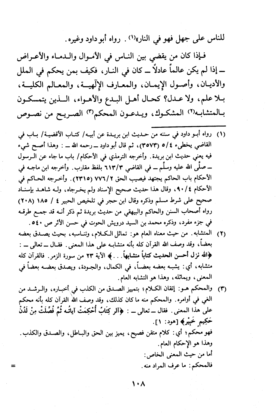 فَإِذَا كَانَ مَنْ يَقْضِي بَيْنَ النَّاسِ فِي الْأَمْوَالِ وَالدِّمَاءِ وَالْأَعْرَاضِ، إِذَا لَمْ يَكُنْ عَالِمًا عَادِلًا، كَانَ فِي النَّارِ، فَكَيْفَ بِمَنْ يَحْكُمُ فِي الْمِلَلِ، وَالْأَدْيَانِ، وَأُصُولِ الْإِيْمَانِ، وَالْمَعَارِفِ الْإِلَهِيَّةِ، وَالْمَعَالِمِ الْكُلِّيَّةِ بِلَا عِلْمٍ، وَلَا عَدْلٍ؟ كَحَالِ أَهْلِ الْبِدَعِ، وَالْأَهْوَاءِ، الَّذِينَ يَتَمَسَّكُونَ بِالْمُتَشَابِهِ الْمَشْكُوكِ، وَيَدَعُونَ الْمُحْكَمَ الصَّرِيحَ مِنْ نُصُوصِ