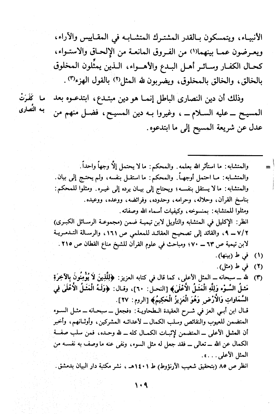 الْأَنْبِيَاءِ وَيَتَمَسَّكُونَ بِالْقَدْرِ الْمُشْتَرَكِ الْمُتَشَابِهِ فِي الْمَقَايِيسِ وَالْآرَاءِ، وَيُعْرِضُونَ عَمَّا بَيْنَهُمَا مِنَ الْفُرُوقِ الْمَانِعَةِ مِنَ الْإِلْحَاقِ وَالِاسْتِوَاءِ، كَحَالِ الْكُفَّارِ، وَسَائِرِ أَهْلِ الْبِدَعِ وَالْأَهْوَاءِ الَّذِينَ يُمَثِّلُونَ الْمَخْلُوقَ بِالْخَالِقِ، وَالْخَالِقَ بِالْمَخْلُوقِ، وَيَضْرِبُونَ لِلَّهِ الْمَثَلَ بِالْقَوْلِ الْهُزْءِ.