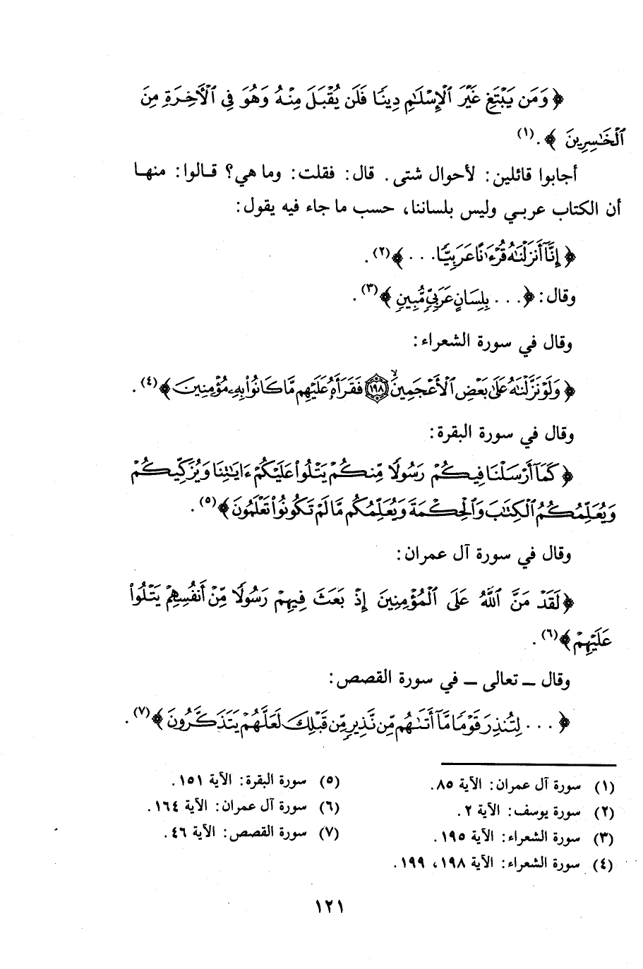 أَجَابُوا قَائِلِينَ: لِأَحْوَالٍ شَتَّى، قَالَ: فَقُلْتُ وَمَا هِيَ؟ قَالُوا: مِنْهَا أَنَّ الْكِتَابَ عَرَبِيٌّ، وَلَيْسَ بِلِسَانِنَا حَسْبَ مَا جَاءَ فِيهِ، يَقُولُ: {إِنَّا أَنْزَلْنَاهُ قُرْآنًا عَرَبِيًّا} [يوسف: 2] .