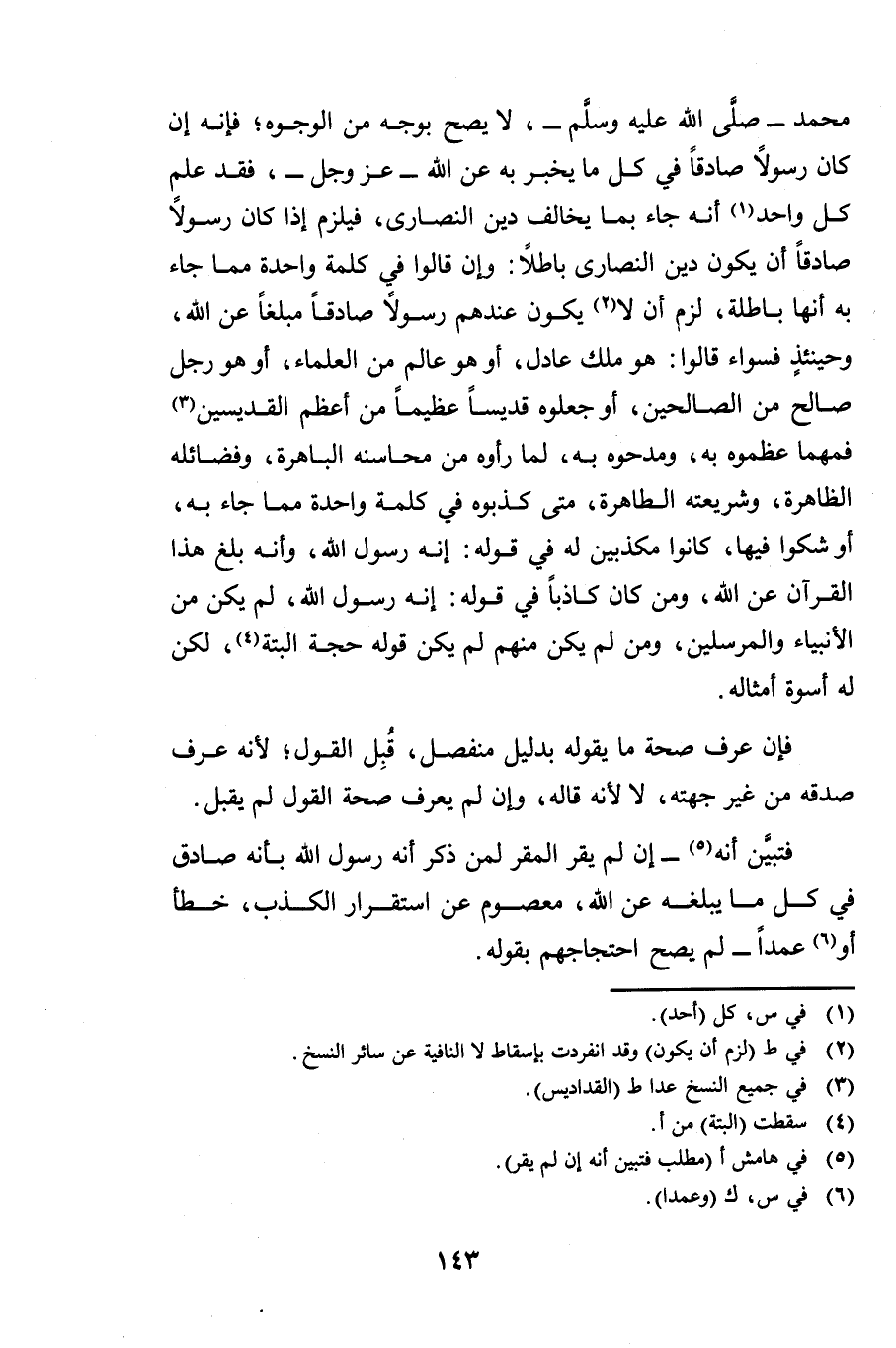 مُحَمَّدٌ صَلَّى اللَّهُ عَلَيْهِ وَسَلَّمَ، لَا يَصِحُّ بِوَجْهٍ مِنَ الْوُجُوهِ، فَإِنَّهُ إِنْ كَانَ رَسُولًا صَادِقًا فِي كُلِّ مَا يُخْبِرُ بِهِ عَنِ اللَّهِ عَزَّ وَجَلَّ، فَقَدْ عَلِمَ كُلُّ وَاحِدٍ أَنَّهُ جَاءَ بِمَا يُخَالِفُ دِينَ النَّصَارَى، فَيَلْزَمُ إِذَا كَانَ رَسُولًا صَادِقًا أَنْ يَكُونَ دِينُ النَّصَارَى بَاطِلًا، وَإِنْ قَالُوا فِي كَلِمَةٍ وَاحِدَةٍ مِمَّا جَاءَ بِهِ أَنَّهَا بَاطِلَةٌ، لَزِمَ أَنْ لَا يَكُونَ عِنْدَهُمْ رَسُولًا صَادِقًا مُبَلِّغًا عَنِ اللَّهِ وَحِينَئِذٍ، فَسَوَاءٌ قَالُوا: هُوَ مَلِكٌ عَادِلٌ، أَوْ هُوَ عَالِمٌ مِنَ الْعُلَمَاءِ، أَوْ هُوَ رَجُلٌ صَالِحٌ مِنَ الصَّالِحِينَ، أَوْ جَعَلُوهُ قِدِّيسًا عَظِيمًا مِنْ أَعْظَمِ الْقِدِّيسِينَ، فَمَهْمَا عَظَّمُوهُ بِهِ وَمَدَحُوهُ بِهِ لِمَا رَأَوْهُ مِنْ مَحَاسِنِهِ الْبَاهِرَةِ وَفَضَائِلِهِ الظَّاهِرَةِ وَشَرِيعَتِهِ الطَّاهِرَةِ، مَتَى كَذَّبُوهُ فِي كَلِمَةٍ وَاحِدَةٍ مِمَّا جَاءَ بِهِ أَوْ شَكُّوا فِيهَا كَانُوا مُكَذِّبِينَ لَهُ فِي قَوْلِهِ: إِنَّهُ رَسُولُ اللَّهِ، وَأَنَّهُ بَلَّغَ هَذَا الْقُرْآنَ عَنِ اللَّهِ، وَمَنْ كَانَ كَاذِبًا فِي قَوْلِهِ: إِنَّهُ رَسُولُ اللَّهِ لَمْ يَكُنْ مِنَ الْأَنْبِيَاءِ وَالْمُرْسَلِينَ، وَمَنْ لَمْ يَكُنْ مِنْهُمْ لَمْ يَكُنْ قَوْلُهُ حُجَّةً أَلْبَتَّةَ، لَكِنَّ لَهُ أُسْوَةَ أَمْثَالِهِ.
