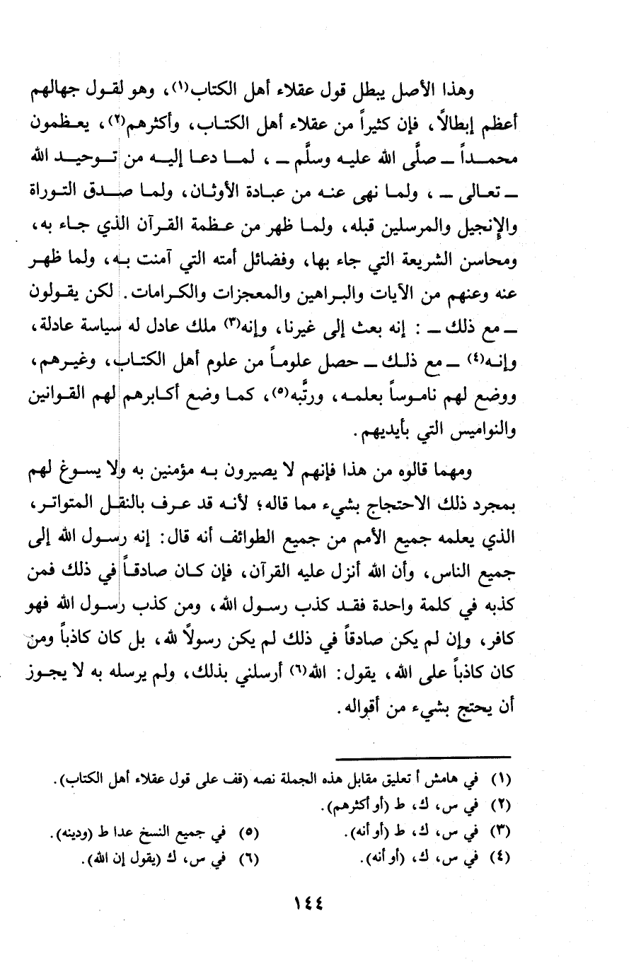 وَهَذَا الْأَصْلُ يُبْطِلُ قَوْلَ عُقَلَاءِ أَهْلِ الْكِتَابِ، وَهُوَ لِقَوْلِ جُهَّالِهِمْ أَعْظَمُ إِبْطَالًا، فَإِنَّ كَثِيرًا مِنْ عُقَلَاءِ أَهْلِ الْكِتَابِ، وَأَكْثَرَهُمْ يُعَظِّمُونَ مُحَمَّدًا صَلَّى اللَّهُ عَلَيْهِ وَسَلَّمَ، لِمَا دَعَا إِلَيْهِ مِنْ تَوْحِيدِ اللَّهِ تَعَالَى، وَلِمَا نَهَى عَنْهُ مِنْ عِبَادَةِ الْأَوْثَانِ، وَلِمَا صَدَّقَ التَّوْارَةَ وَالْإِنْجِيلَ، وَالْمُرْسَلِينَ قَبْلَهُ، وَلِمَا ظَهَرَ مِنْ عَظَمَةِ الْقُرْآنِ الَّذِي جَاءَ بِهِ، وَمَحَاسِنِ الشَّرِيعَةِ الَّتِي جَاءَ بِهَا، وَفَضَائِلِ أُمَّتِهِ الَّتِي آمَنَتْ بِهِ، وَلِمَا ظَهَرَ عَنْهُ وَعَنْهُمْ مِنَ الْآيَاتِ، وَالْبَرَاهِينِ، وَالْمُعْجِزَاتِ، وَالْكَرَامَاتِ، لَكِنْ يَقُولُونَ مَعَ ذَلِكَ: إِنَّهُ بُعِثَ إِلَى غَيْرِنَا، وَإِنَّهُ مَلِكٌ عَادِلٌ، لَهُ سِيَاسَةٌ عَادِلَةٌ، وَإِنَّهُ مَعَ ذَلِكَ حَصَّلَ عُلُومًا مِنْ عُلُومِ أَهْلِ الْكِتَابِ وَغَيْرِهِمْ، وَوَضَعَ لَهُمْ نَامُوسًا بِعِلْمِهِ وَرُتَبِهِ، كَمَا وَضَعَ أَكَابِرُهُمْ لَهُمُ الْقَوَانِينَ، وَالنَّوَامِيسَ الَّتِي بِأَيْدِيهِمْ