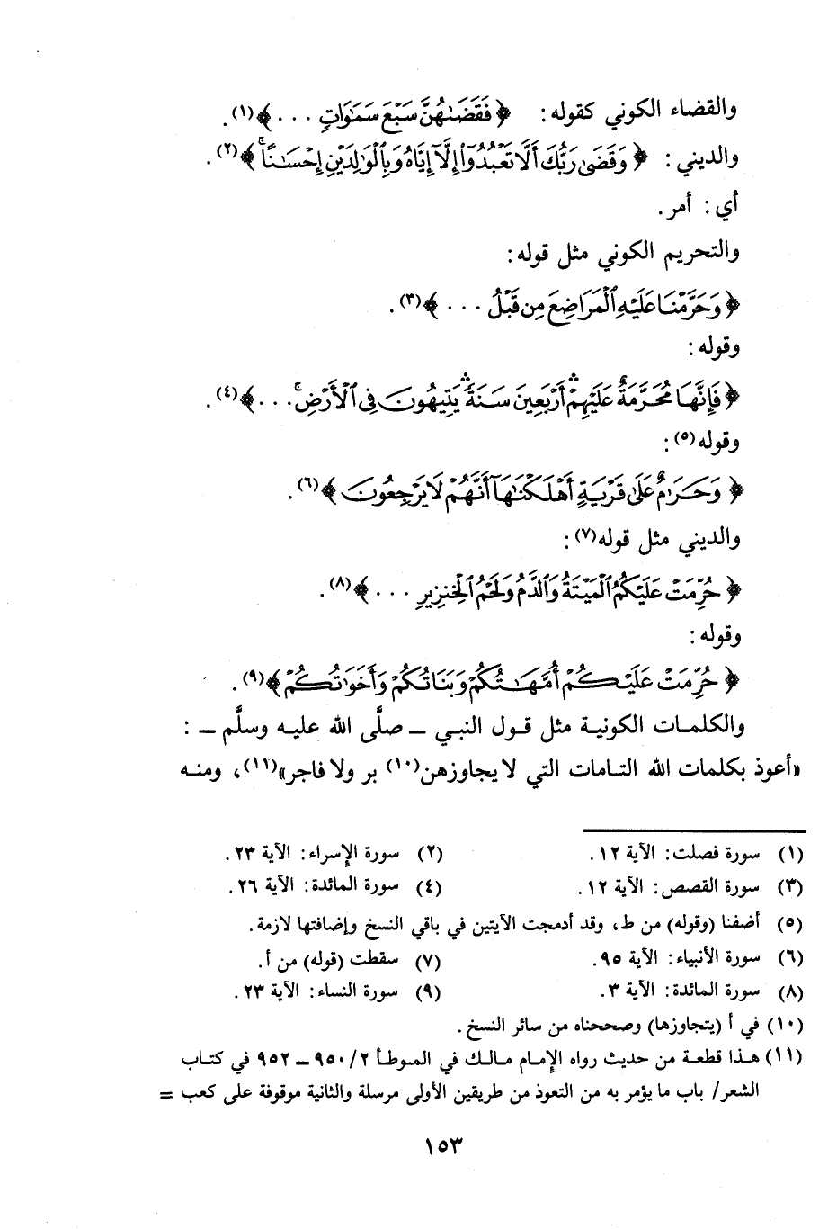 وَالْكَلِمَاتُ الْكَوْنِيَّةُ، مِثْلُ قَوْلِ النَّبِيِّ، صَلَّى اللَّهُ عَلَيْهِ وَسَلَّمَ: «أَعُوذُ بِكَلِمَاتِ اللَّهِ التَّامَّاتِ، الَّتِي لَا يُجَاوِزُهُنَّ بَرٌّ، وَلَا فَاجِرٌ» . وَمِنْهُ