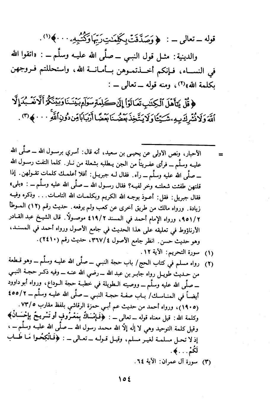 وَالدِّينِيَّةُ: مِثْلُ قَوْلِ النَّبِيِّ صَلَّى اللَّهُ عَلَيْهِ وَسَلَّمَ: «اتَّقُوا اللَّهَ فِي النِّسَاءِ، فَإِنَّكُمْ أَخَذْتُمُوهُنَّ بِأَمَانَةِ اللَّهِ، وَاسْتَحْلَلْتُمْ فُرُوجَهُنَّ بِكَلِمَةِ اللَّهِ» . وَمِنْهُ قَوْلُهُ تَعَالَى: {قُلْ يَاأَهْلَ الْكِتَابِ تَعَالَوْا إِلَى كَلِمَةٍ سَوَاءٍ بَيْنَنَا وَبَيْنَكُمْ أَلَّا نَعْبُدَ إِلَّا اللَّهَ وَلَا نُشْرِكَ بِهِ شَيْئًا وَلَا يَتَّخِذَ بَعْضُنَا بَعْضًا أَرْبَابًا مِنْ دُونِ اللَّهِ} [آل عمران: 64] .
