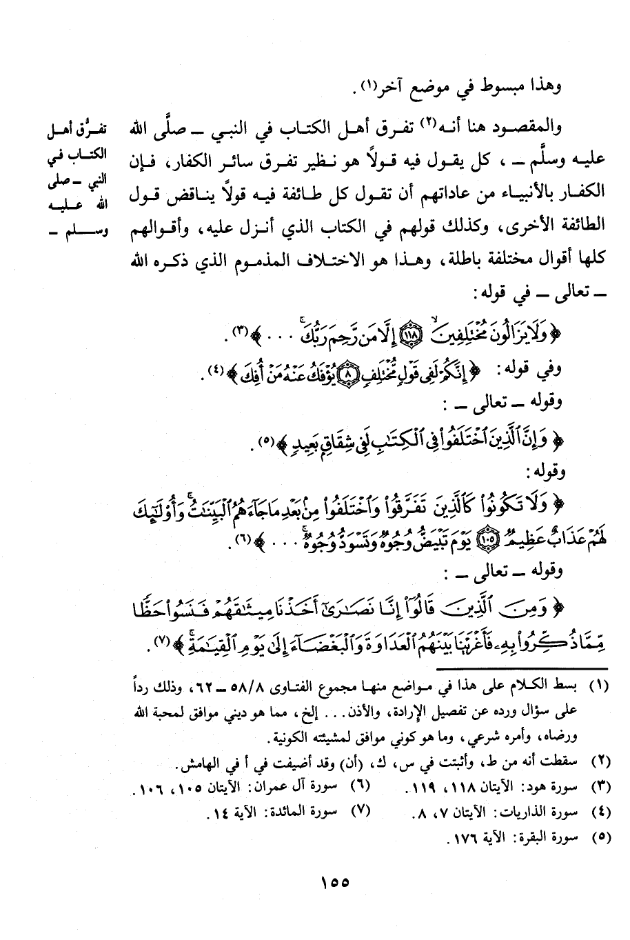 وَالْمَقْصُودُ هُنَا أَنَّهُ تَفَرُّقُ أَهْلِ الْكِتَابِ فِي النَّبِيِّ صَلَّى اللَّهُ عَلَيْهِ وَسَلَّمَ، كُلٌّ يَقُولُ فِيهِ قَوْلًا هُوَ نَظِيرُ تَفَرُّقِ سَائِرِ الْكُفَّارِ، فَإِنَّ الْكُفَّارَ بِالْأَنْبِيَاءِ مِنْ عَادَاتِهِمْ أَنْ تَقُولَ كُلُّ طَائِفَةٍ فِيهِ قَوْلًا يُنَاقِضُ قَوْلَ الطَّائِفَةِ الْأُخْرَى، وَكَذَلِكَ قَوْلُهُمْ فِي الْكِتَابِ الَّذِي أُنْزِلَ عَلَيْهِ، وَأَقْوَالُهُمْ كُلُّهَا أَقْوَالٌ مُخْتَلِفَةٌ بَاطِلَةٌ، وَهَذَا هُوَ الِاخْتِلَافُ الْمَذْمُومُ الَّذِي ذَكَرَهُ اللَّهُ تَعَالَى فِي قَوْلِهِ: {وَلَا يَزَالُونَ مُخْتَلِفِينَ إِلَّا مَنْ رَحِمَ رَبُّكَ} [هود: 118] .