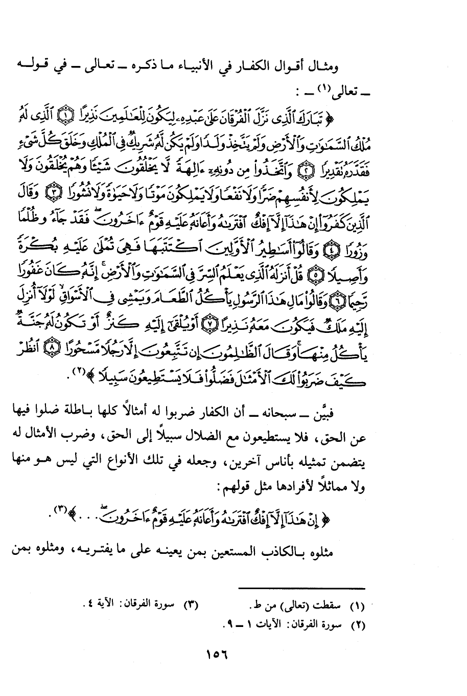 وَمِثَالُ أَقْوَالِ الْكُفَّارِ فِي الْأَنْبِيَاءِ مَا ذَكَرَهُ تَعَالَى فِي قَوْلِهِ تَعَالَى: {تَبَارَكَ الَّذِي نَزَّلَ الْفُرْقَانَ عَلَى عَبْدِهِ لِيَكُونَ لِلْعَالَمِينَ نَذِيرًا - الَّذِي لَهُ مُلْكُ السَّمَاوَاتِ وَالْأَرْضِ وَلَمْ يَتَّخِذْ وَلَدًا وَلَمْ يَكُنْ لَهُ شَرِيكٌ فِي الْمُلْكِ وَخَلَقَ كُلَّ شَيْءٍ فَقَدَّرَهُ تَقْدِيرًا - وَاتَّخَذُوا مِنْ دُونِهِ آلِهَةً لَا يَخْلُقُونَ شَيْئًا وَهُمْ يُخْلَقُونَ وَلَا يَمْلِكُونَ لِأَنْفُسِهِمْ ضَرًّا وَلَا نَفْعًا وَلَا يَمْلِكُونَ مَوْتًا وَلَا حَيَاةً وَلَا نُشُورًا - وَقَالَ الَّذِينَ كَفَرُوا إِنْ هَذَا إِلَّا إِفْكٌ افْتَرَاهُ وَأَعَانَهُ عَلَيْهِ قَوْمٌ آخَرُونَ فَقَدْ جَاءُوا ظُلْمًا وَزُورًا - وَقَالُوا أَسَاطِيرُ الْأَوَّلِينَ اكْتَتَبَهَا فَهِيَ تُمْلَى عَلَيْهِ بُكْرَةً وَأَصِيلًا - قُلْ أَنْزَلَهُ الَّذِي يَعْلَمُ السِّرَّ فِي السَّمَاوَاتِ وَالْأَرْضِ إِنَّهُ كَانَ غَفُورًا رَحِيمًا - وَقَالُوا مَالِ هَذَا الرَّسُولِ يَأْكُلُ الطَّعَامَ وَيَمْشِي فِي الْأَسْوَاقِ لَوْلَا أُنْزِلَ إِلَيْهِ مَلَكٌ فَيَكُونَ مَعَهُ نَذِيرًا - أَوْ يُلْقَى إِلَيْهِ كَنْزٌ أَوْ تَكُونُ لَهُ جَنَّةٌ يَأْكُلُ مِنْهَا وَقَالَ الظَّالِمُونَ إِنْ تَتَّبِعُونَ إِلَّا رَجُلًا مَسْحُورًا - انْظُرْ كَيْفَ ضَرَبُوا لَكَ الْأَمْثَالَ فَضَلُّوا فَلَا يَسْتَطِيعُونَ سَبِيلًا} [الفرقان: 1 - 9] .
