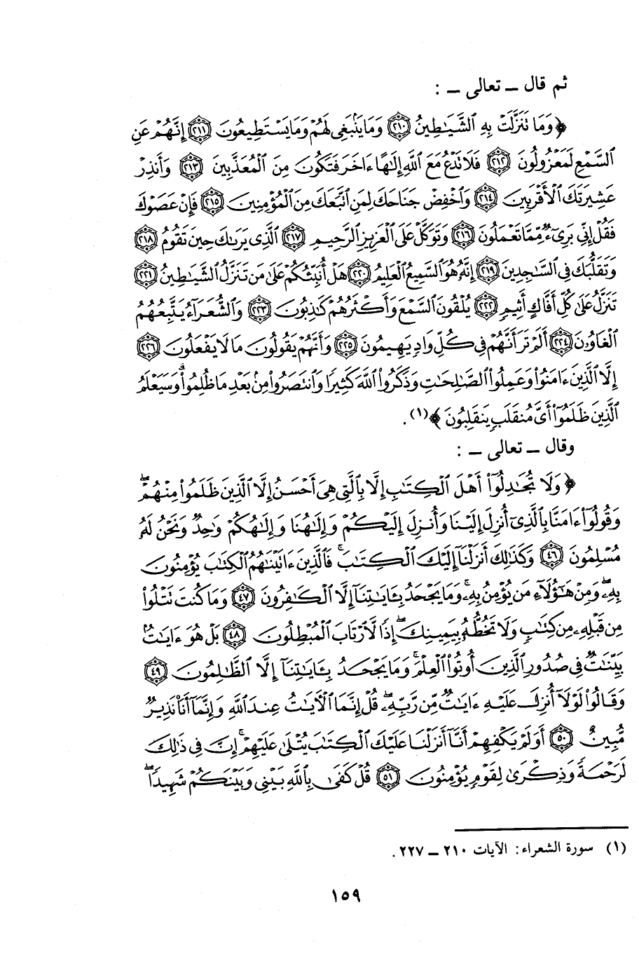 ثُمَّ قَالَ تَعَالَى: {وَمَا تَنَزَّلَتْ بِهِ الشَّيَاطِينُ - وَمَا يَنْبَغِي لَهُمْ وَمَا يَسْتَطِيعُونَ - إِنَّهُمْ عَنِ السَّمْعِ لَمَعْزُولُونَ - فَلَا تَدْعُ مَعَ اللَّهِ إِلَهًا آخَرَ فَتَكُونَ مِنَ الْمُعَذَّبِينَ - وَأَنْذِرْ عَشِيرَتَكَ الْأَقْرَبِينَ - وَاخْفِضْ جَنَاحَكَ لِمَنِ اتَّبَعَكَ مِنَ الْمُؤْمِنِينَ - فَإِنْ عَصَوْكَ فَقُلْ إِنِّي بَرِيءٌ مِمَّا تَعْمَلُونَ - وَتَوَكَّلْ عَلَى الْعَزِيزِ الرَّحِيمِ - الَّذِي يَرَاكَ حِينَ تَقُومُ - وَتَقَلُّبَكَ فِي السَّاجِدِينَ - إِنَّهُ هُوَ السَّمِيعُ الْعَلِيمُ - هَلْ أُنَبِّئُكُمْ عَلَى مَنْ تَنَزَّلُ الشَّيَاطِينُ - تَنَزَّلُ عَلَى كُلِّ أَفَّاكٍ أَثِيمٍ - يُلْقُونَ السَّمْعَ وَأَكْثَرُهُمْ كَاذِبُونَ - وَالشُّعَرَاءُ يَتَّبِعُهُمُ الْغَاوُونَ - أَلَمْ تَرَ أَنَّهُمْ فِي كُلِّ وَادٍ يَهِيمُونَ - وَأَنَّهُمْ يَقُولُونَ مَا لَا يَفْعَلُونَ - إِلَّا الَّذِينَ آمَنُوا وَعَمِلُوا الصَّالِحَاتِ وَذَكَرُوا اللَّهَ كَثِيرًا وَانْتَصَرُوا مِنْ بَعْدِ مَا ظُلِمُوا وَسَيَعْلَمُ الَّذِينَ ظَلَمُوا أَيَّ مُنْقَلَبٍ يَنْقَلِبُونَ} [الشعراء: 210 - 227] .